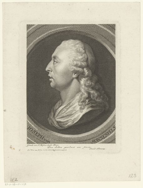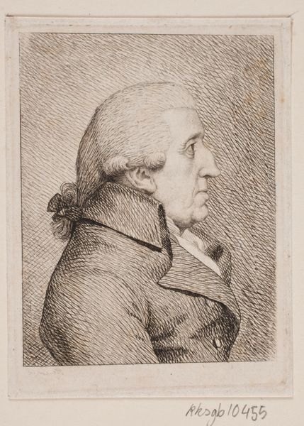 Curator: This finely wrought engraving, dating from 1777, offers a compelling glimpse into the artistic milieu of the time. We see the initials of the artist "J.F. Clemens." under the title "Clemens", at the Statens Museum for Kunst, Copenhagen. What is your immediate take? Editor: A very crisp image, isn't it? Despite its age, the lines are so precise, so deliberate. It evokes a sense of formality, almost of reverence. But there's a starkness to it as well. A sense of distance. Curator: Distance is interesting. Engravings, prints—they served a crucial function in disseminating images, weren't just artistic expressions but instruments of public record. And what could be recorded or circulated? Powerful people of course. Editor: Exactly, power inscribed on paper. The choice of profile view reinforces that sense of authority. It’s a very controlled, almost stoic presentation. But those stark lines...they speak of something else. Of definition but also limitation. What symbols do you glean from this piece? Curator: Beyond the subject, which carries obvious connotations, the background is more evocative. Vertical hatching abuts an open field of stippled background. This suggests, I think, that within the ordered portraiture exists the hint of an untamed element. His ruffled fur coat does hint towards this other aspect to his otherwise tailored profile, no? Editor: I see it, a contained wildness. Perhaps the artist suggests a cultivated gentleman versus raw humanity, an ideal rather than the messy reality of an actual man? And I'm drawn to how the precision of the engraving lends a certain weight. It gives an almost photographic sense of capturing something truthful. But it can be staged truth too. Curator: Always, truth is mediated, framed—especially in portraiture. It speaks to the complex interplay of representation, perception, and power that runs through artistic production. Editor: This portrait leaves you contemplating the social narratives spun around image making back then and now. Who's captured? How? And why? It feels less about Clemens himself and more a signifier for what he represented. Curator: Precisely. The engraving then becomes not just an image but a historical document, speaking volumes about the society that produced and consumed it.