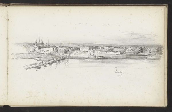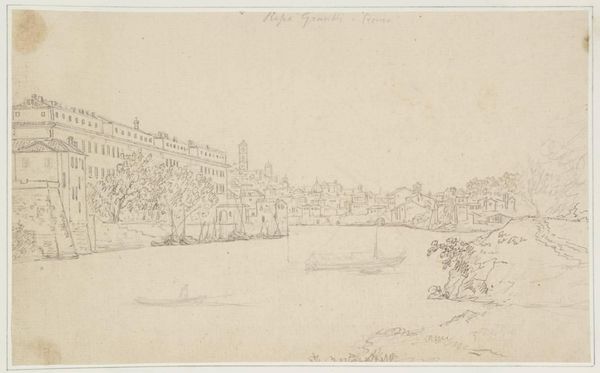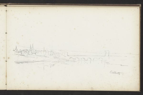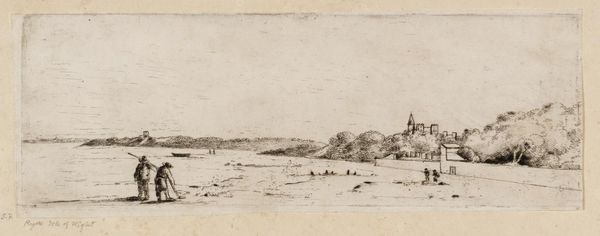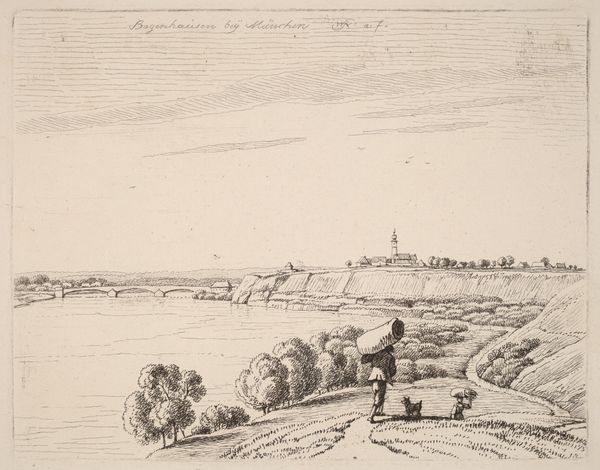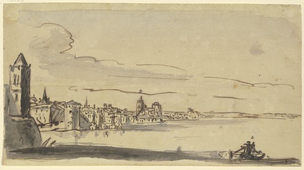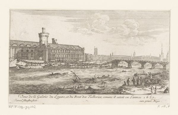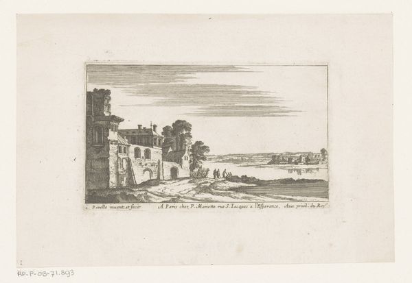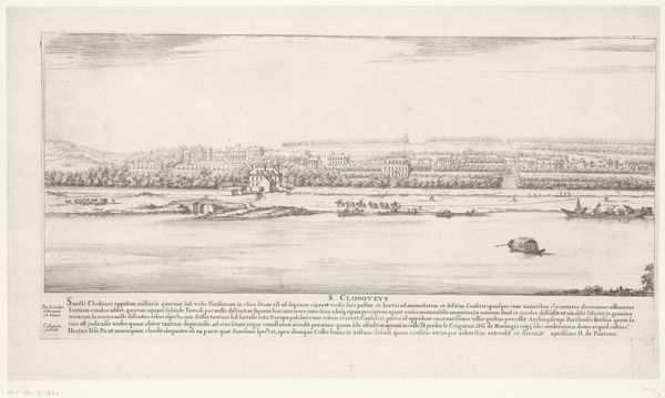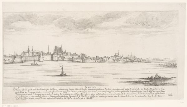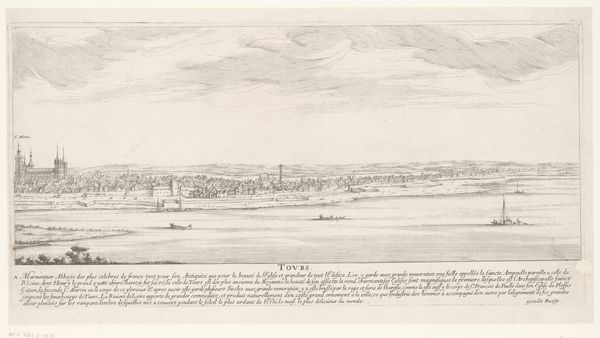 François Collignon created this etching of "Zicht op Angers" in the 17th century. Immediately, the horizontal composition arrests the eye. The panoramic view is neatly divided into three distinct layers: the detailed cityscape, the calm river, and the subtle sky above. Collignon uses line to create depth and texture. Notice how the intricate network of lines defines the architectural forms of Angers, contrasting with the smoother, more fluid lines of the water and sky. This layering creates a visual rhythm, inviting the viewer to move between the different elements of the scene. The structured layout of the print reflects a broader philosophical interest in order and perspective. The scene's measured depiction suggests a desire to capture and control the landscape through representation, and the etching invites us to consider how such representations shape our understanding of space and place. Consider, then, how the deliberate arrangement of space in "Zicht op Angers" functions not only aesthetically but also as a commentary on the relationship between humanity and the natural world.