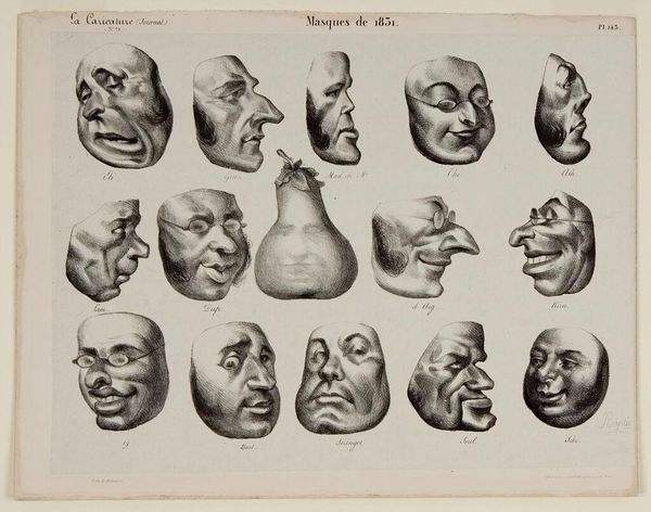 Curator: Daumier’s lithograph, "Masks of 1831," crafted in 1832, presents a grid of caricature portraits. It’s quite striking, isn’t it? Editor: Absolutely, the immediate impression is unsettling. The stark contrast, almost brutal. They appear more like grotesque masks than portraits, embodying the turbulent politics, perhaps? Curator: Exactly. As a print made for 'La Caricature,' this work highlights the materials readily available for mass production at the time. Daumier used lithography, printing from stone, to disseminate political critique to a broad audience. Editor: Yes, and this particular plate exposes the key figures of the July Monarchy in France. I am curious about what message the artist aims to send when positioning an actual pear next to the caricature profiles, especially given that the pear was already a common symbol of King Louis-Philippe? Curator: Daumier shrewdly used this readily understandable visual language of his day to challenge authority. The mass-produced format meant more people could access and share in this subversive critique of political power, effectively lampooning figures through accessible printed matter. Editor: We must note the satirical choices Daumier made while rendering the prints, paying close attention to the grotesque exaggerations, and strategically manipulating light and shadow to cast his subjects into roles that are less about the character and more about critiquing systems of control. How do we look beyond these individuals to talk about the larger implications for social change? Curator: The method of production made this sort of cultural defiance possible. Daumier skillfully exploited lithography to mobilize a resistance movement, demonstrating how ordinary material processes might question elitist, traditional structures. Editor: And it emphasizes how socially conscious work such as Daumier's helped shape a burgeoning cultural landscape, providing grounds for free thinking, where art acts not just as representation, but also as instigator and mirror to larger sociopolitical changes and realities. Curator: Considering Daumier’s clever handling of readily available resources, the piece emphasizes the democratizing aspect of art when coupled with intent and purpose. Editor: Precisely, by taking aim at prevalent power structures, he invited discussion, controversy, and eventually, perhaps, positive structural changes to long standing societal injustices. It remains profoundly relevant even now.