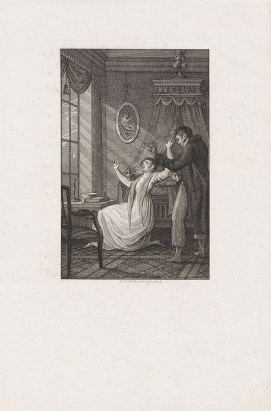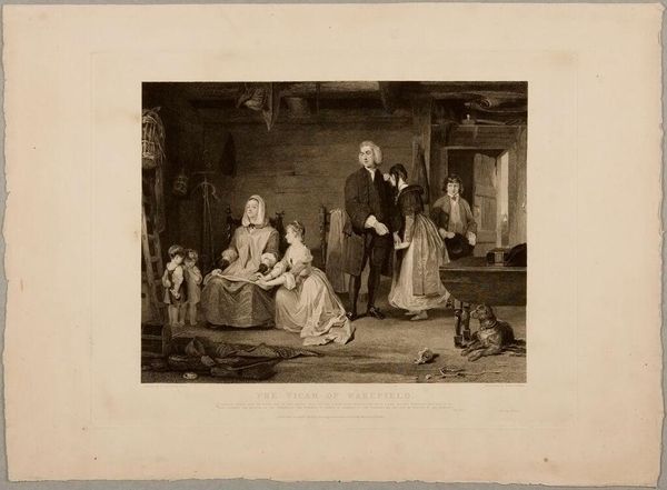 Editor: This is George Bellows' print, "The Last Victim." It's a monochromatic scene, and immediately, I'm struck by the stark contrast and the chaotic composition. What visual elements stand out to you in this piece? Curator: The composition, indeed, is carefully constructed to evoke unease. Note the asymmetrical distribution of figures, the stark contrast between light and shadow. Consider how the artist's use of line and form contributes to the overall dramatic effect. Do you perceive any specific patterns? Editor: I see the repetition of diagonal lines—the window, the bodies—which seems to heighten the sense of instability and violence. Curator: Precisely. The diagonals create a dynamic tension, preventing the eye from resting. This deliberate disruption of visual harmony serves to amplify the emotional impact of the subject matter. We find similar visual techniques throughout art history when tragedy or violence is depicted. Editor: It’s unsettling how the formal elements reinforce the subject matter. I'll definitely look at art with a more critical eye from now on. Curator: As will I.