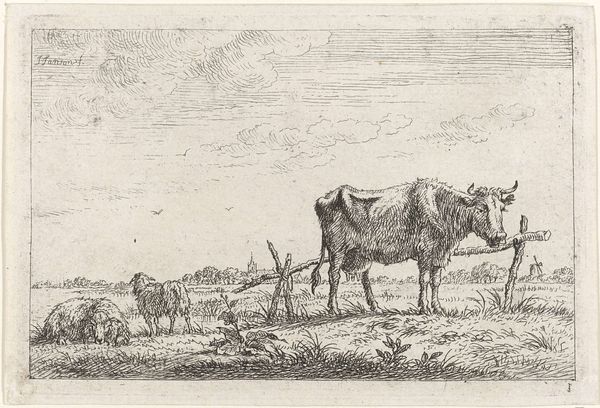 Curator: Here we have Fréderic Thédore Faber’s "Zittende Herder," or "Seated Shepherd," created around 1806. It's currently part of the Rijksmuseum's collection. What are your initial thoughts on this piece? Editor: There's a real sense of pastoral melancholy in this drawing. The shepherd seems almost dwarfed by his flock, lost in contemplation. Curator: Indeed. Faber created this etching at a time when the Dutch art world was looking back to its Golden Age, to the art of simple, rural life. You can see the influence of artists like Paulus Potter, but filtered through a more romantic lens. The public was experiencing intense urbanization so idyllic pictures became a coping mechanism of sorts. Editor: I see that yearning for an imagined past. But also, looking at the details, I’m struck by how much labor is present even in this 'idyllic' scene. The shepherd isn’t just existing, he is working and has his place in a clear socio-economic order. It forces us to reflect on those labor dynamics. Curator: Precisely. And it is a loaded one! Pastoral scenes are frequently politically conservative since they romanticize supposed times when everything was in order in terms of social dynamics, therefore a critique from someone looking back now could very well focus on that political dimension, which, of course, isn't always visible at first sight. Editor: It’s those complexities, those quiet tensions that make this more than just a pretty landscape, more than just the perfect illustration. Curator: I concur! Faber gives us a window into a complex, evolving society through deceptively simple scenes. What strikes you most, now after analyzing some historical and political context? Editor: The ability of art to disguise complex ideology through seemingly neutral topics; It is so thought-provoking, considering our own modern lens. Thank you. Curator: A perfect note to conclude. Thank you!