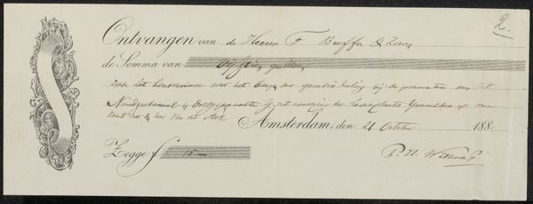 Editor: Here we have "Kwitantie voor J.H. Rutgers", possibly from 1879, attributed to Frans Buffa en Zonen. It’s an ink drawing on paper – a receipt, really. I find the combination of precise calligraphy and the ornate, almost dreamlike, sketched frame quite intriguing. What draws your eye to this piece? Curator: It whispers tales of commerce, doesn’t it? Imagine, an artist receiving payment! I'm struck by how this simple document, meant for mundane accounting, is elevated by the elegant script and flourishes. Look closely at the way the ink bleeds ever so slightly into the paper - does that imperfection somehow humanize the transaction? Editor: Definitely! It’s not just a cold financial record; it’s got a human touch. The handwritten element makes you consider the actual individuals involved, their handcraft. Curator: Exactly! And think about the context: Amsterdam, late 19th century, a hub of trade and artistic innovation. Does the receipt’s reference to “stilleven” [still life]—"two paintings, still life"—hint at a local interest in this artform at the time? It’s like a miniature portal, hinting at an entire world. Editor: So, beyond its face value, this receipt is also a sign of the art world in Amsterdam. It feels so private and almost accidental – a glimpse into another world. I’d never considered a receipt a piece of art. Curator: Sometimes the most ordinary objects carry extraordinary stories! Don't you love that? The intersection of art and everyday life—it's a reminder that beauty can be found where we least expect it.