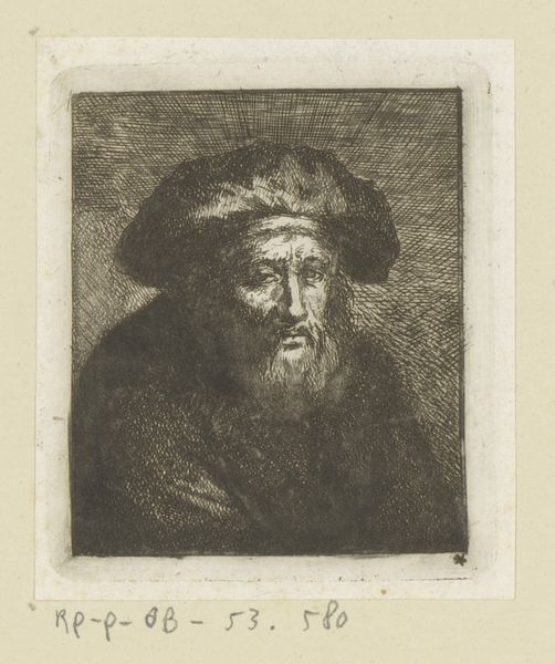 Curator: Welcome. Here we have Jacobus Ludovicus Cornet's "Oude man met baard," created sometime between 1825 and 1882. It is an engraving printed on paper. Editor: Immediately, there's this potent somberness emanating from the man's face and dark surroundings. The textures are palpable despite the simple palette. It feels both aged and timeless, no? Curator: Indeed. The line work is masterful, particularly in the rendering of the beard, a chaotic but controlled explosion of strokes that define the man's age and, perhaps, wisdom. Editor: I'm drawn to the process of engraving. Imagine the physical act of carving into that copper plate, each line deliberate, almost a mark of labor that mirrors the weight of time etched onto the subject's face. What can you tell me of the original making? Curator: The print’s graphic arrangement presents the human likeness and experience through the use of only line, shape, tone, and texture to portray detail, emphasizing pure art qualities. Look, especially, at the shadows, used with so much subtlety and depth around the hat and shoulders. Editor: Consider what printmaking allowed—the mass dissemination of images to broader audiences. Was Cornet striving to portray universal qualities about aging, mortality, and knowledge through the subject, a humble "old man," and via the accessibility of print? Curator: That could certainly be inferred. Yet, when viewing the final work of art in a Realist style and in the portrait form, the artistic merit really resides in Cornet's facility with this material; how lines coalesce to form textures, and tonality to represent both material substance and emotive depths. The focus moves, ultimately, back to aesthetic construction. Editor: The very material tells its own story, from the plate's physical transformation at the hand of Cornet to the distribution of the image into wider circulation to more modest communities. Such works humanize history and offer pathways to consider where we, in contemporary terms, meet it today. Curator: A most interesting point of intersection to conclude on. The value of seeing as intrinsic versus making connections outside its context is perhaps its great enduring quality.