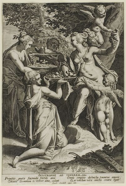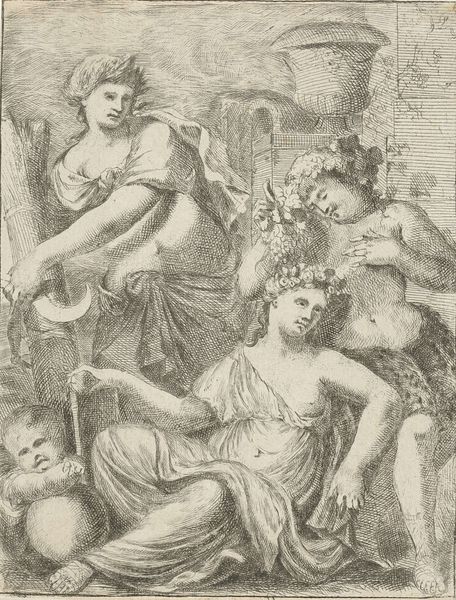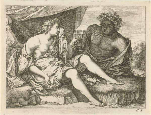 Curator: It's interesting how stark and…well, disturbing it feels at first glance, right? It's called "Lot and his Daughters," made in 1551 by Dirck Volckertsz Coornhert, here in the Rijksmuseum. The medium is engraving, a really linear, stark medium, as you can see. Editor: Disturbing is putting it mildly. Talk about family drama… even without knowing the biblical tale, the tension and discomfort radiating off of these figures is palpable. Is that wine? What are we looking at here, symbolically? Curator: Exactly! It depicts the aftermath of the destruction of Sodom. Lot and his daughters are shown seeking refuge in a cave, with the daughters eventually getting their father drunk in order to continue their lineage. The act of pouring is very prominent, isn’t it? Note the daughter pouring wine–or perhaps some other strong intoxicant. What do you make of that cup she is using, though? Editor: The composition is undeniably strong. I keep going back to the setting… It's a pretty literal interpretation of a "cave." Visually claustrophobic. Symbolically? Represents being trapped? Confined, maybe, both physically and morally. Curator: The cave absolutely speaks to confinement, both physical and moral. The whole scene feels burdened with fate. Think about it: The line work in the engraving adds to the weighty, almost oppressive atmosphere. Every etched line feels deliberate. It is difficult not to reflect on how deeply the cultural narratives are passed. I believe the vessels they hold–both pitcher and drinking cup–become vehicles through which the sins of the past echo into the present and threaten to define the future. Editor: So much for divine intervention being all sunshine and rainbows! Visually, though, the lack of subtlety… there's a rawness to it. You’re left with these exposed, raw, almost unsettling, bodies. Not the "ideal" bodies, are they? It gives this engraving an almost documentary feel, as though they may have sat and had someone record it exactly as it all was. And what of the lack of shading overall? Very little is hidden here… very little mystery. Curator: In that time, Northern Renaissance prints favored a certain directness. More graphic clarity, so to speak. But let’s pause before ascribing intentions too hastily! This stark clarity lends itself to very interesting symbolic work around human fallibility. After all, even in fleeing destruction, they cannot escape, can they? Their "cave" is as much within themselves. I find that such a message resonates even today, don’t you? Editor: Absolutely. The layers in this aren’t immediately obvious, but peel them back and it hits hard. I might need a glass of wine after this.