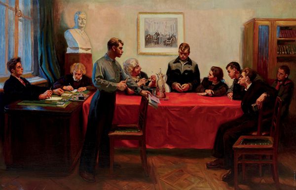 Curator: Upon viewing this captivating scene, my immediate thought is the sheer dynamism of childhood captured. The energy is almost palpable. Editor: Indeed. We’re looking at Georgios Jakobides' "Fragment from the 'Children's Concert'", an oil on canvas created in 1899. Jakobides was a key figure in establishing academic realism in Greece, often portraying scenes of children. Curator: He certainly had an eye for domesticity and childhood. What strikes me is the almost chaotic yet ordered arrangement—a very real depiction of a child’s world, wouldn't you agree? Editor: Absolutely. Note how he frames them against the light of the window, using the plants almost like a proscenium arch. It creates a kind of contained theatre within the domestic space, raising questions about the roles children are expected to play within the social structures of their time. Curator: A sharp point. Do you see that the implied noisiness is really compelling? The slight blurring hints at movement and activity. Yet, the muted palette – the browns and greys, makes it intimate, not jarring. It’s not a spectacle; it is simply life happening. Editor: Precisely, and by choosing such a quotidian subject, Jakobides perhaps indirectly comments on the evolving status of the family and childhood at the fin de siècle. As traditional agrarian societies transitioned towards modernity, images of childhood gained a certain idealized, sentimental value, that maybe carries more weight than first realized. Curator: Do you think there’s a subtext about societal expectations woven in here, considering its context? Editor: Potentially. In portraying these children engaged in play—albeit seemingly organized—Jakobides reflects the era’s anxieties and hopes tied to the future generation and education, where music or artistic pursuit were deemed signs of cultured upbringing. The setting itself seems significant as plants frame these figures with soft light – all signs point to care. Curator: Very well-put. Seeing it now, after this conversation, makes it seem to whisper rather than shout; subtle nuances unfold where there were only children making noise initially. Editor: That's exactly it. It is about observing how the seemingly innocent or mundane offers subtle commentaries on identity, culture and collective experience of the modern condition.