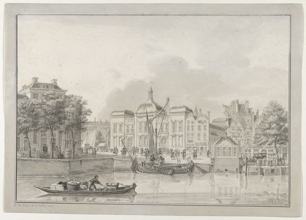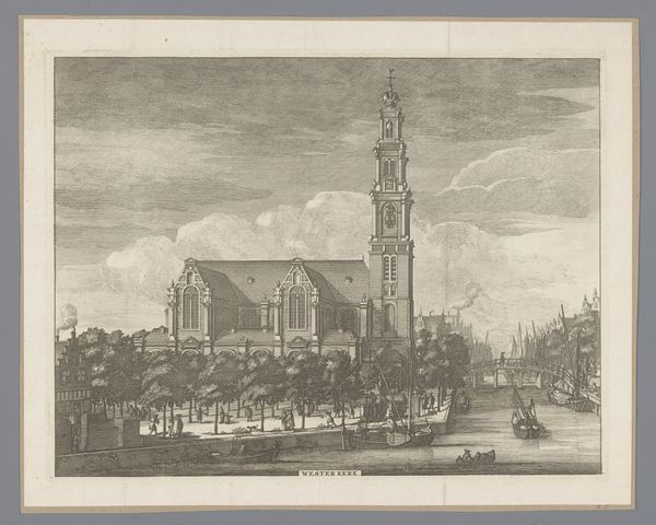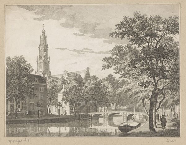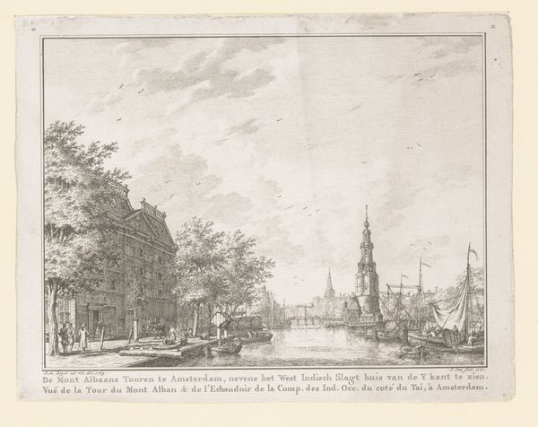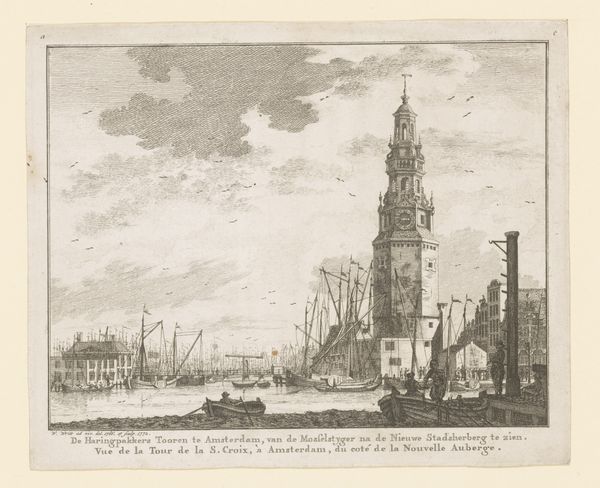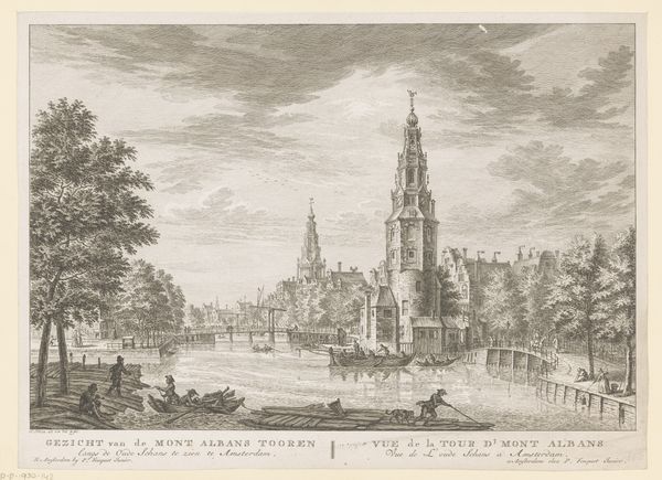 Curator: The print before us, likely observed as a peaceful, serene snapshot in 1765, shows us the 'Gezicht op de Munttoren te Amsterdam', or 'View of the Munttoren in Amsterdam'. Editor: The overwhelming mood here is one of quiet order. The precise linework and architectural detail certainly present a scene that feels more planned than lived-in, despite the presence of people. Almost like a stage set waiting for actors. Curator: And in that theatre, notice how the Munttoren acts as the centerpiece; anchoring the entire scene, and by extension, the socio-economic and political authority invested in Dutch Golden Age Amsterdam. The use of etching so wonderfully portrays the architectural and civic confidence so proudly displayed in cityscapes of the period. Editor: Definitely a constructed version of reality. Look closely and it seems like those figures in the foreground, the fashionable couple by the bench—they are there as tokens to make the image marketable. Did the average person even recognize this version of their city, or even feel part of the narrative? It begs so many questions. Curator: That tension is quite poignant. Consider the intended audience. Likely affluent merchants or city officials eager to possess images celebrating the city’s prominence. What makes it Baroque? Editor: Perhaps it’s more 'Dutch Golden Age' in its emphasis on detailed realism, but there's also Baroque influence visible. That slight dramatization in lighting, an implicit layering, and even the almost theatrical staging. These elements build the intensity, and there’s such mastery of detail, I can almost feel the cool air of a Dutch canal evening. Curator: You have an eye for the sensorial quality in those details. I hadn't noticed the coolness but it is evident as you look for it. Editor: Art is as much about feeling as it is about understanding, and here, in this meticulous scene, it brings alive Amsterdam as it once proudly stood. It is indeed a window. Curator: And a reminder that cities, like artworks, are always layered with intentions and impressions.