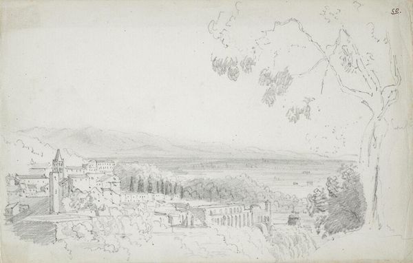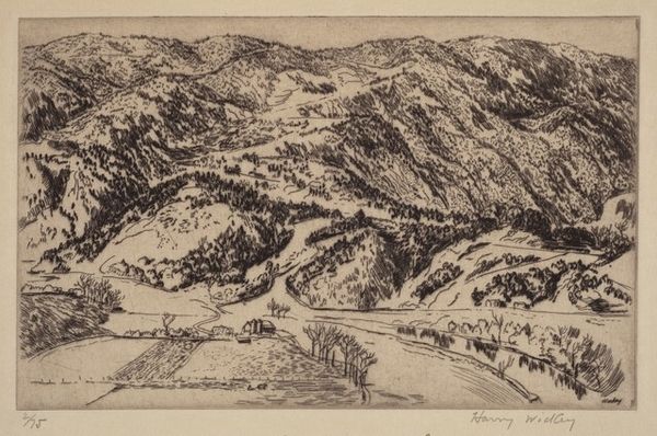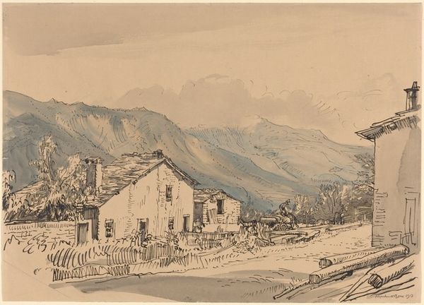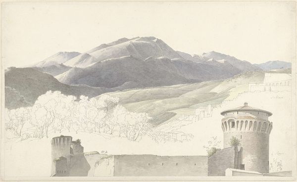 Editor: This watercolor painting is called "Falicon" by David Young Cameron. It renders a hillside village. The colors are muted. It gives the impression of something half-remembered. What elements stand out to you most prominently? Curator: Immediately, the stratified composition strikes me. The work exhibits a tripartite structure: a foreground, middle ground featuring the village, and a background defined by the soft suggestion of distant mountains. The tonality is delicate. Editor: The artist seems to emphasize structure. Curator: Precisely. Notice the terraced fields leading up to the village. The parallel lines create a rhythmic progression. Consider the contrast in textures: the softness of the atmospheric mountains versus the more articulated architectural forms. How does this interplay of textures contribute to the overall aesthetic? Editor: It feels almost like the buildings have been forced into place on top of the landscape itself. There's a slight tension there. Curator: An astute observation. And the restricted palette reinforces this sense of harmony, yes? The artist orchestrates a dialogue between form and surface, drawing the viewer's eye across the pictorial space. Are you sensing a calculated organization of elements? Editor: I think so, because I do keep moving back and forth between those distinct foreground and background areas you pointed out. Curator: The power lies in its structural arrangement and the visual cadence that Cameron achieves. It reminds us of the artist's ability to evoke the essence of a place through purely formal means. Editor: I'm learning to see how seemingly simple choices can build very complex relationships on the canvas.