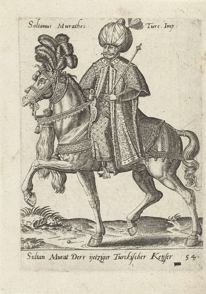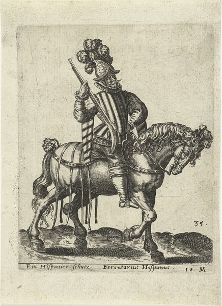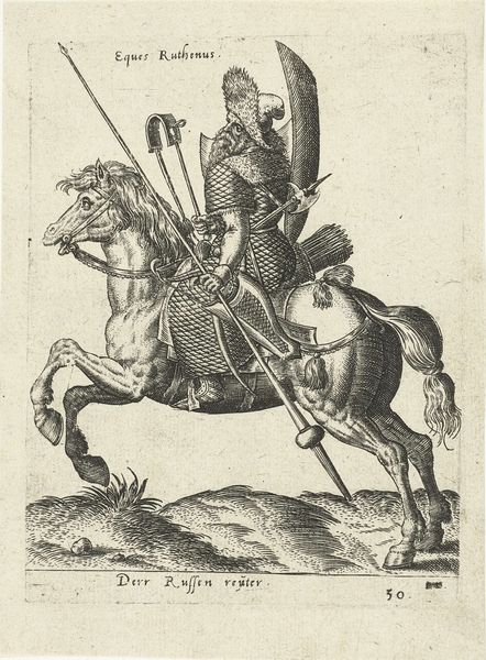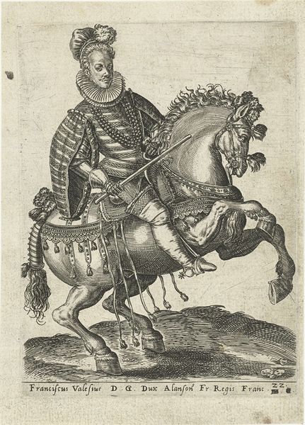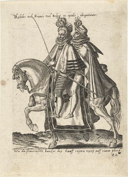 Abraham de Bruyn created this print, titled "Nederlandse prins te paard," meaning Dutch Prince on Horseback, likely in the late 16th century. Note the prominent display of the horse and rider motif, a symbol deeply rooted in the iconography of power and nobility since antiquity. From the equestrian statues of Roman emperors to Renaissance portrayals of monarchs, the horse has been employed to signify control, authority, and military prowess. Yet, observe how this symbol of dominance is tempered. The horse's slightly weary expression, the rider's composed but not overtly aggressive posture – these elements introduce a layer of human complexity. The prince's garb is as much a signifier as the horse. His attire speaks to a complex interplay between tradition and a burgeoning sense of national identity in the Netherlands. This careful balance is a powerful force, engaging viewers on a deep, subconscious level. The symbolism evolves, reflecting changing cultural values. The echoes of the past resonate, but the present reshapes the narrative, contributing to the cyclical progression of meaning across time.