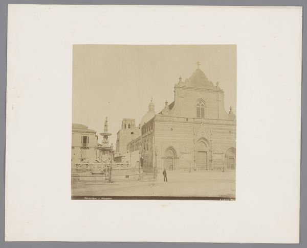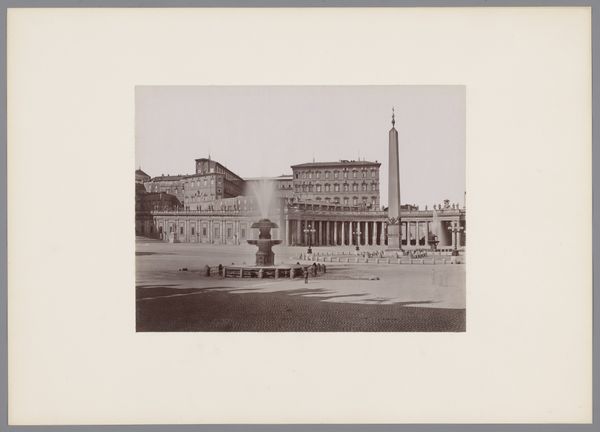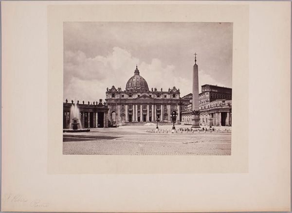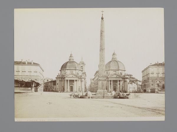 Editor: This is a photograph, a gelatin-silver print, titled "Piazza del Popolo in Rome with obelisk and view of two churches" made sometime between 1852 and 1900 by Fratelli Alinari. It’s a remarkably composed cityscape. What strikes me is the imposing stillness and symmetry of the scene. How do you interpret this work? Curator: That stillness is fascinating, isn't it? Consider the historical context: photography itself was still relatively new. What stories does this silence tell us about the way Rome presented itself, or wished to be seen, at the height of the Risorgimento? The Piazza, with its obelisk – a symbol of ancient power, re-erected by a papal authority – stands in stark contrast to the rising nationalist sentiments. Notice how the churches are framed; not as expressions of faith, but as architectural components of urban power. How does this planned urban space become a stage for political theater? Editor: I see your point. It’s less about religious expression and more about papal control visually reinforced through architecture. The deliberate arrangement speaks to that power dynamic. Curator: Exactly. Think about the relationship between the photographer, the subject, and the intended audience. Who was this image for? And what message was it intended to convey? Is it about Roman grandeur, or a more subtle negotiation between church, state, and the people? This isn't just a picture; it’s a carefully constructed narrative about power, identity and the reshaping of a nation. Editor: This makes me think about how photography, even then, was being used to shape and control narratives. It is far more than a mere representation of reality. I now see so much in this frozen moment of time! Curator: Precisely. The beauty is in unraveling the layers.