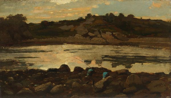 Eugène Boudin created this oil on canvas titled 'Environs De Brest. Embouchure De L’élorn', and immediately the eye is drawn to its muted palette and the striking contrast between the rugged foreground and the serene estuary beyond. The composition divides the canvas into distinct horizontal layers: the textured earth, the tranquil water, and the overcast sky. Boudin masterfully uses the materiality of paint to create depth and distance. The foreground is built up with thick, visible brushstrokes that capture the roughness of the landscape. These tangible marks contrast sharply with the smooth, almost ethereal treatment of the sky and water, achieving a sense of atmospheric perspective. This approach reflects the Realist movement's interest in capturing the immediate, sensory experience of nature. Yet, the work also flirts with the sublime. The imposing rock formations and the vast expanse of water hint at nature's indifference to human presence, evoking a sense of awe. Notice how the painting destabilizes the traditional landscape by focusing less on the picturesque and more on the raw, unidealized aspects of the environment. This emphasis invites us to reconsider our relationship with the natural world.