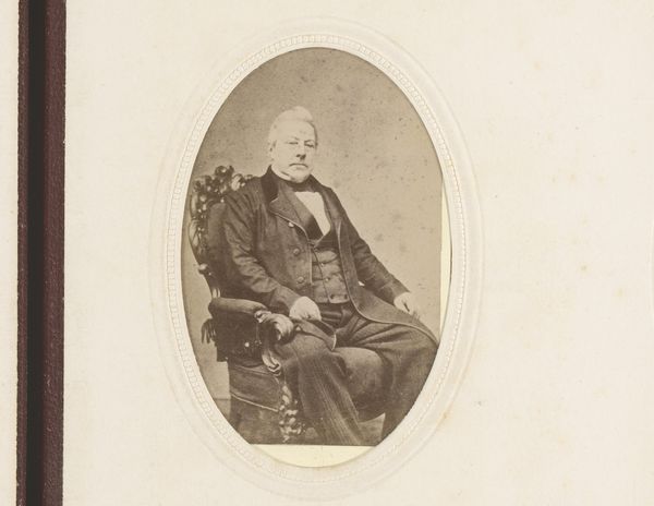 Curator: I'm struck by the rather solemn feeling conveyed in this image. Editor: Agreed. We're looking at a gelatin silver print, produced between 1856 and 1859. It's titled "[Portrait of Major Anderson]" and the photographer, Horatio Ross, has created a very stately impression. Look at the fine grain, achieved through the printing process, bringing depth to the textures of the fabric. Curator: Yes, there’s a deliberateness. Notice how his somewhat stern gaze connects directly with the viewer. It creates a directness despite the physical distance and the passage of time. His holding a document, and the cane… they speak of authority, or at least a certain gravitas expected from someone in his position. Editor: The composition, with Major Anderson seated slightly off-center, also reinforces a feeling of accessible power, wouldn’t you say? The dark coat contrasts nicely with what seems to be an unstarched white shirt, a casual, and almost nonchalant signifier of upper-class nonchalance. Curator: And there is the detail of the cane. Its presence seems ceremonial as well. Canes and walking sticks are well-worn, symbolic shorthand that is coded for ideas about power, but in this image, there also might be another reason. Major Anderson may actually use it. Editor: An excellent observation. He certainly anchors himself well on that metalwork bench, an object that signifies a well-kept, yet lived-in domestic space. His coat also shows signs of real wear. He’s presented to us as a real human, not just as some symbolic construction of manhood and authority. Curator: He represents a tension of accessibility and an expectation of the powerful, something I find really compelling. It prompts me to question our understanding of the figures that wield symbolic or societal authority in our present. Editor: The tension between manufactured public identity and the intimate details of how lives are really lived continues to fascinate and is revealed here. This portrait certainly holds many complex visual insights on class, presentation and time.
