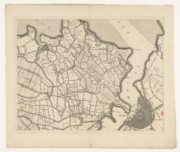 Editor: This is a section of "Kaart van de provincie Utrecht", made after 1696 by Thomas Doesburgh, a drawing using ink and etching. It feels very precise, almost sterile, but in a strangely comforting way. What do you make of this, beyond just a map? Curator: Beyond the practical… hmm. Imagine Doesburgh tracing these lines, each one a conscious decision, mapping not just land, but the very spirit of Utrecht. The precise details feel Baroque, right? A need to capture every nuance of the landscape. And those sweeping rivers – don’t they almost look like veins pumping life into the province? Editor: I see that. But why present a landscape with so much...detail? Curator: Perhaps a sense of ownership? Of understanding the lay of the land intimately. Consider also the rise of cartography in that era; mapping was power, knowledge, control. Think about how personal mapping is even now, on our phones. A record of where we’ve been, and maybe even where we're going, no? Doesburgh gives you his intimate feel for Utrecht. Editor: That makes sense. It's like he's saying, "This is *my* Utrecht, as I see it." And the way he draws it, almost like a portrait. Curator: Exactly! It’s an embrace, a very baroque embrace of a specific place in time. Editor: Wow, I came in thinking "old map", but now it feels almost like a love letter to a province. Curator: Isn't it lovely when art surprises us like that? Now, let's look at some of the individual linework...