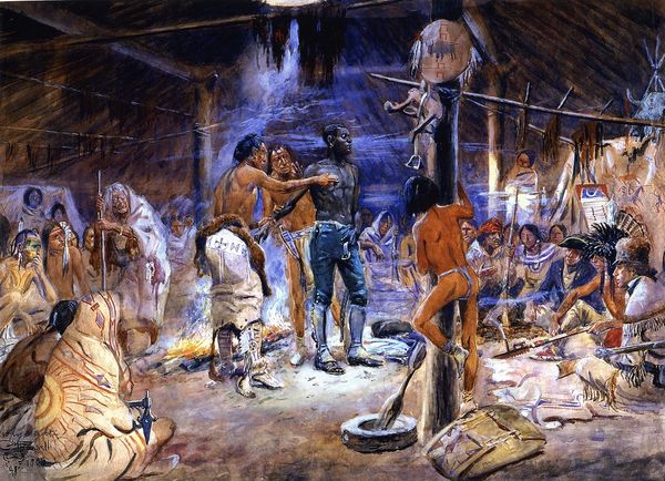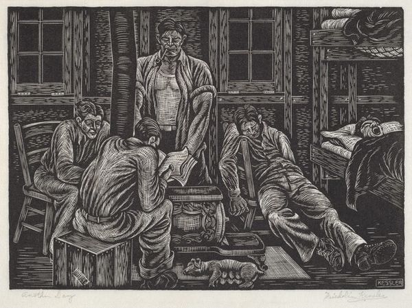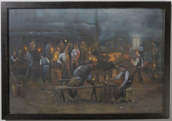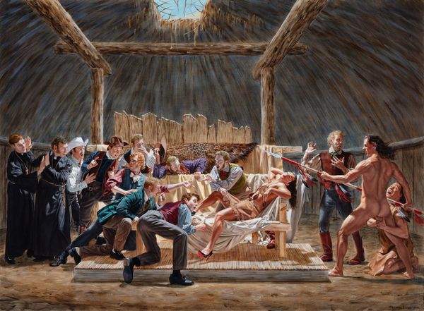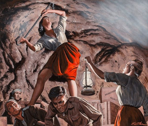 Editor: Mort Künstler’s painting, "King Rat," created in 1964, really jumps out. It depicts a tense scene with a group of men surrounding another in what seems to be a confrontation. There's definitely a power dynamic at play. What do you see in this piece, and how do you interpret it? Curator: I see a stark depiction of power and its abuses within a confined social structure. The ‘King Rat,’ as the title suggests, wields authority, likely exploiting his position amidst the backdrop of war and its brutal realities. Consider how class and social standing often intersected within military contexts; did some groups suffer disproportionately compared to others, based on race or other social identities? Editor: It’s hard to miss the way the figure in the cap seems to be asserting his authority, directing others as to how they should behave. And that guy pointing; what a position of privilege and power he has. Curator: Exactly. Let's think about what 'authority' signifies here. Are these figures upholding military order or perpetuating injustice under the guise of war? Notice their collective gaze – whom does it serve, and whom does it oppress? We can view it as an academic depiction of social stratification that becomes especially cruel and pronounced during the fog of war. It speaks volumes about the artist’s understanding of not just conflict but also social dynamics. Editor: Thinking about that power dynamic you mentioned makes me consider how some of these systems are perpetuated across different environments and contexts beyond just war. Curator: Precisely. And recognizing those patterns is where we can begin to analyze critically how authority, influence, and power affect real-world experiences for various marginalized communities. Editor: I see this piece in a new light now! The discussion made me understand the layers of social dynamics represented here.