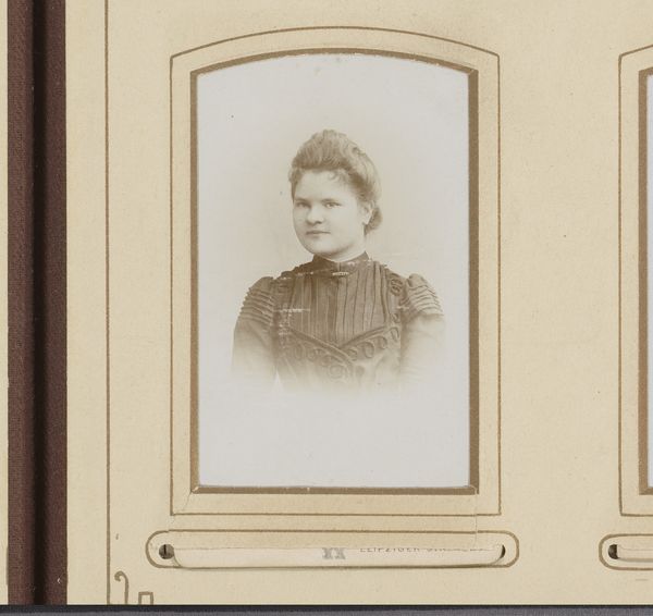 Curator: This arresting portrait, simply titled "Portret van een vrouw", is thought to date from somewhere between 1900 and 1940. I’m immediately struck by the poise and quiet determination in her expression. Editor: Yes, it’s the gaze that holds one, isn’t it? And look at the texture created by the photographer, perhaps intentionally highlighting the sitter’s social position. Curator: I find the formal framing within the photograph intriguing. The double framing device creates an interesting layering, almost as if viewing her through lenses of both time and status. The geometric lines play against the organic curves of her face and hair. Editor: I agree, but it also speaks to the mechanics of photography at the time – the materials needed, the sitter's posed labor in maintaining stillness for exposure, all to make a statement. Note the printed photographer’s details underneath. This wasn't just about art; it was a crafted service available on the Veemarkt. Curator: Absolutely, the semiotic reading offers layers of analysis: The subject's tightly bound hair and high collared dress indicate late 19th, early 20th century modesty and controlled femininity. It also speaks to broader themes about representation in this period. Editor: Yes, and if we read into that material context – mass produced fashion and increased commercial opportunity met growing photographic availability and a burgeoning middle class wanting access to portraiture that communicated social identity. Curator: It becomes clear then that this piece is an historical document and a composition study. The soft light lends her skin a marble-like quality which makes her an object, even if she has her own presence. Editor: For me, knowing more of the photographic process opens up avenues beyond formalism. From darkroom alchemy to market availability, a story beyond poise and class, this portrait captures the human need to see and be seen. Curator: Indeed, between technical art and social snapshot. Editor: Precisely. An intimate insight.