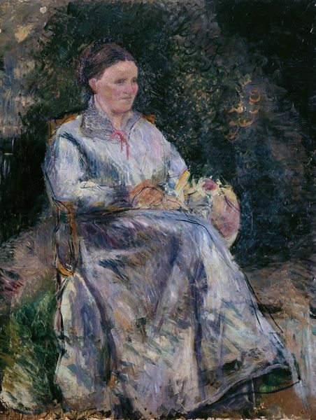 Curator: This is Renoir's "Young Woman with a Dog," painted in 1876. The blurry strokes of oil paint almost hide the subjects of the work. Editor: It's lovely! The texture created by those strokes is really something. It looks as though the scene could dissolve into pure light and colour at any moment. I find it hard to ignore the fact the woman seems totally absorbed in what she’s doing. What's your interpretation? Curator: Well, Renoir, as an Impressionist, was deeply involved in depicting modern life. But what kind of woman do you see represented, and what is she doing? This question connects with broader societal issues and the art market. Editor: She's holding something small, perhaps flowers? And dressed fairly simply... she looks like she might be a member of the emerging bourgeoisie, caught in a moment of quiet leisure. Not doing the type of manual labor that a working-class girl might. Curator: Exactly! Renoir’s paintings catered to this emerging bourgeois class. Now, consider the role of the dog. Is it just a pet, or does it have a deeper symbolic resonance tied to ideas of domesticity? Editor: It is certainly small and fluffy enough to act more like a decoration, or some kind of social prop, a symbol of status? In some ways this image really speaks to a specific societal moment of industrialising society, especially with a focus on private moments and ownership... Curator: Precisely. This piece illustrates how impressionism catered to—and helped to define—the sensibilities of the bourgeoisie through the private ownership of paintings like this. What was novel was representing what seemed to be every-day modern moments. Editor: That’s fascinating. It definitely puts the artwork in a richer context. I'll never look at a Renoir the same way again! Curator: Glad to share a new way of interpreting art. Thinking about the societal impact of the images is equally valid as exploring the visual aesthetics.