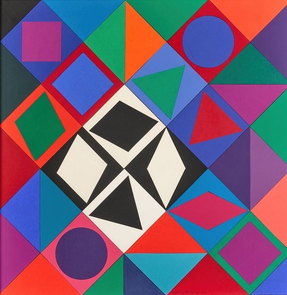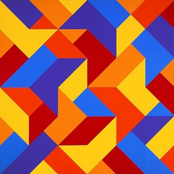 Victor Vasarely made this painting, titled 'Pauk-SP', with what looks like pretty flat color and hard edges. What I notice first is how the whole composition seems to be built on a simple repeated shape, echoed and amplified, which builds the whole image through the repetition of its form. I can almost feel the flatness of the paint and the texture seems super smooth, like it was maybe done with stencils. It’s cool how Vasarely used color shifts within each shape, going from light to dark to trick your eye into seeing depth where there isn't any. I like how that red diamond at the top makes the whole thing kind of pulse. It's like he's playing with how we see, making a very cool painting out of something so straightforward. This piece reminds me a bit of Bridget Riley’s work because it also messes with perception and creates optical illusions. But where Riley feels more organic, Vasarely is all about that clean, geometric vibe, showing how simple forms can create complex visual experiences, always keeping us guessing about what we're actually seeing.