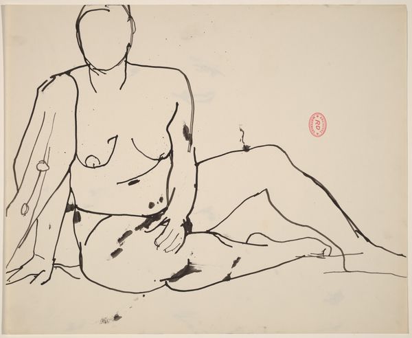 Editor: Here we have Ernst Ludwig Kirchner's "Reclining female nude," created around 1911 using pencil on paper. It's interesting how such simple lines manage to convey so much. What catches your eye when you look at this work? Curator: My focus is drawn immediately to the expressive lines. Observe how Kirchner utilizes a nervous, almost agitated line quality to define the figure. Notice, in particular, the stark contrasts: sharp, angular strokes are juxtaposed against the softer curves meant to represent flesh. These tensions articulate not only form, but also convey the psychological intensity so characteristic of Expressionism. Editor: So, it's less about representing the body accurately and more about the feelings it evokes? Curator: Precisely. Consider the compositional strategy: the figure is framed by what appears to be an implied circular form—perhaps a bed or cushion. How does that enhance or detract from your reading of the work? Editor: It almost traps her. It adds to that feeling of unease. I also find her gaze introspective, she doesn't look comfortable. Is this a typical representation of the nude for that time? Curator: Traditional nudes often presented the female form as idealized and passive. Kirchner disrupts this convention. The visible marks of the artist’s hand, the raw quality of the line, actively assert the artist's subjective experience. The lines have more of an angsty feel rather than flowy or sensual curves, adding to that slightly unnerving feeling that it communicates. This can be read as resistance against the academy. What have you gained from our examination of this work? Editor: I see now how the lines and composition themselves tell the story and express feeling, and that formal qualities have a purpose that may diverge from tradition.