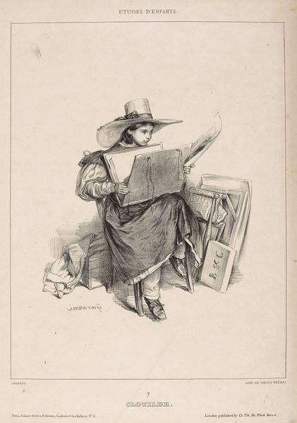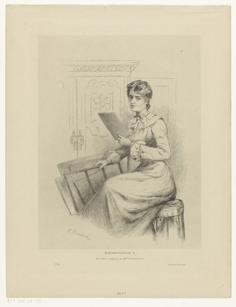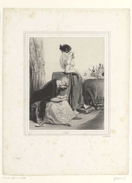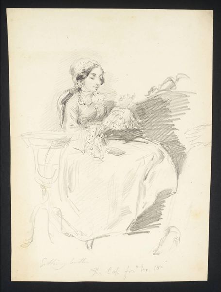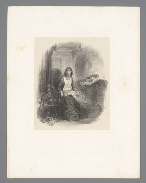 Editor: This is "Clara bewondert de halsketting die ze van Gustave heeft gekregen," a pencil drawing by Nicolas Maurin, dating from around 1825 to 1842. It depicts a woman spinning thread. The delicate pencil work gives it an intimate, almost sentimental feel. What can you tell me about this piece? Curator: Well, the piece immediately situates itself within the visual culture of Romanticism, where we see a fascination with domesticity, and an idealised view of women's roles within it. The presence of the spinning wheel signifies both labour and virtue, associating Clara with traditional feminine skills and roles. Who are Gustave and Clara? Is their narrative reflected in any other artworks? Editor: That's a great question; I haven’t researched those specific individuals, but the title certainly suggests a romantic relationship, highlighted by the gift of a necklace. How might the politics of imagery factor into our understanding of it? Curator: That's key here! It’s important to understand the role of such imagery in reinforcing social expectations. Women were often represented in these kinds of domestic settings, arguably as a way of celebrating, but also limiting their sphere of influence. This work begs the question – does it celebrate feminine virtue or reinforce existing power structures? Editor: So, is it fair to say that artwork such as this both reflects and shapes the societal view of women in that time? Curator: Absolutely. Artists didn’t work in a vacuum. Pieces like this played a role in defining and circulating certain notions of femininity. I think it’s productive to consider this artwork alongside other forms of cultural expression prevalent during the period to see how widespread these visual motifs were. What does this reinforce about art's broader social functions? Editor: This has given me a lot to think about in terms of how we contextualise art within its historical and social landscape. Curator: And for me it serves as a reminder of how rich and intricate social structures of the past are visible in visual mediums, inviting the public to reflect critically on the way art echoes and informs reality.