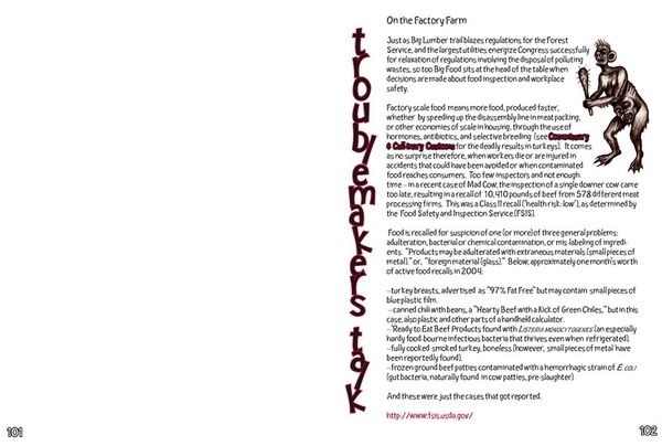 Curator: This print, called "Rush," is a work by Sue Coe. Immediately I feel overwhelmed by the density and claustrophobia it evokes. Editor: Yes, its graphic nature certainly pulls you in. What’s fascinating is how Coe seems to use the form of a seemingly straightforward brochure, but its actual production is quite complex, given its origins as a collage that was then printed. It disrupts any easy access for the viewer, mimicking the obstructions it’s pointing toward. Curator: I see a cacophony of distorted figures—gargoyles and menacing sprites—all seemingly drawn in this high-contrast, almost woodcut style, giving them a haunting quality. They really tap into a sense of unease. Their expressions alone convey anxiety and despair. Editor: Exactly. These aren't simply monsters. Look closer at their placement relative to the blocks of text; they create this hierarchy, highlighting how certain narratives become prioritized. This is clearly a comment on labor and even propaganda; its creation serves to manufacture a certain consent by literally “blocking” the view. This challenges our notions of objective truth and delves into manufactured experiences. Curator: The entire artwork functions like a map. But rather than offering clear directions, it plunges the viewer into a symbolic and possibly corrupt entertainment experience. The pointed language feels intentionally jarring. It forces a discomfort on the reader that they'll either be able to move through to examine what it means, or recoil from it. Editor: And if one considers the tradition of printmaking itself—historically tied to disseminating information, often for the ruling class—this piece asks some pretty hard questions about accessibility. In other words, who are these brochures *really* for, what's their provenance, and what are they distracting us from? Curator: I’ll certainly think differently about brochures going forward! The layered, critical approach invites extended reflection and discussion on exploitation and control. Editor: I agree; "Rush" compels one to question the very structure of manufactured consent and the price we pay when we become a part of it.