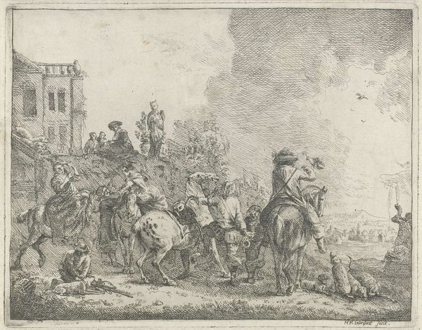 Editor: So, here we have Pieter Nolpe's "Slag bij Borgerhout," or "Battle of Borgerhout," from 1643. It's an etching, and looking at it, the first thing that strikes me is how busy it is! The detail is incredible, especially considering the medium. How would you interpret this work? Curator: As a materialist, I see this etching as more than just a depiction of a battle. Consider the socio-economic context: printmaking in the 17th century was a burgeoning industry. It democratized images, making historical events accessible to a wider audience, not just the wealthy elite. The etching process itself, the labour involved, the dissemination of the final product – that’s where the real story lies. How does the material production shape our understanding of the historical narrative? Editor: That's interesting. I was focusing on the composition – the chaos of battle versus the serene landscape in the background. Curator: Precisely, but let’s push further. The material, the etching, inherently limits the level of detail. How does that affect the portrayal of the battle? Is Nolpe glorifying the event or offering a more nuanced perspective shaped by the constraints of his craft? What’s the role of the printmaker as a producer of historical narratives, and how are they implicated in that process? Editor: So, the very act of creating the print becomes part of the historical document itself? Curator: Exactly! The labour, the cost of materials, the distribution networks - all influence what stories get told and how they are told. It challenges the traditional view of the artist as simply a detached observer, placing them firmly within the social and economic structures of their time. Editor: I never thought about it that way. I was so caught up in the historical aspect that I missed the materiality of the work entirely. Thanks! Curator: My pleasure. Examining the material conditions of art production opens up entirely new avenues for understanding history and culture.