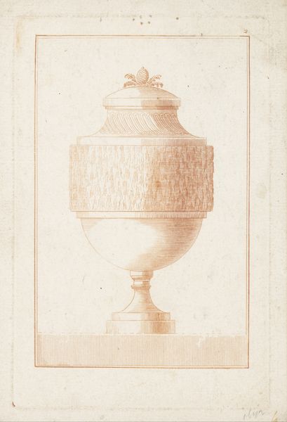 Curator: This is "Antieke vaas met deksel," or "Antique Vase with Lid," a print made by P. (l'ainé) Moithey in 1767. It's rendered as a delicate engraving on paper, exhibiting a distinct Neoclassical style. Editor: My immediate impression is one of understated elegance. The terracotta monochrome is beautiful, creating a kind of austere yet harmonious balance. Curator: Indeed. The print exemplifies Neoclassical ideals of order and clarity. Vase designs like this were deeply embedded in 18th-century visual culture, linked to ideas of civic virtue and the revival of classical aesthetics. The choice of depicting an antique vase was a direct commentary on the social and political values of the time. Editor: Absolutely, I find myself questioning whose values exactly. It looks to me that it is drawing on class and exclusivity. I find myself thinking about who possessed such decorative items. It would likely reflect their status and taste, especially amidst the burgeoning consumer culture of the late 18th century, no? Curator: Precisely. Think of the Grand Tour and the fashion for collecting antiquities, feeding back into the elite cultures of consumption. Moithey’s print almost functions as a catalog, showcasing designs to inspire patrons. These seemingly simple engravings are potent symbols of cultural capital. The very concept of "antiquity" was being constructed and commodified in this era. Editor: Looking closer, the lion-headed handles feel less refined and somewhat brutal against the otherwise pure geometric lines of the piece. And, that base makes the vase look unstable on what appears to be a ledge made of stone. I’m not sure the composition achieves an ideal I admire, personally. Curator: I appreciate that you picked up on the lion heads; they provide a fascinating glimpse into the complex semiotics of power and prestige during that time. I also observe an emphasis on line which reinforces the vase's geometric design but has implications to how those ideals took root within France. The emphasis that this movement made when reinforcing ideals through social reforms were ultimately rooted in white supremacy. Editor: Interesting, and something to keep in mind. Seeing art through multiple perspectives helps provide insight and broaden one's scope of how the viewer observes the artwork in its specific context. Curator: Well, considering Moithey's vase alongside social and historical frameworks enables a more profound connection to it as we question its function.