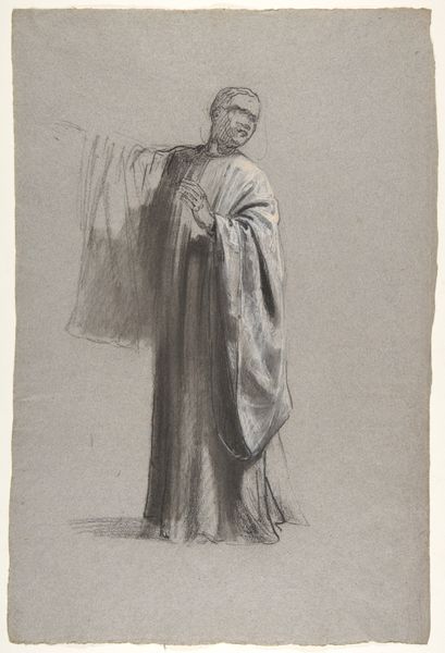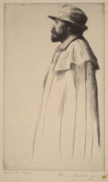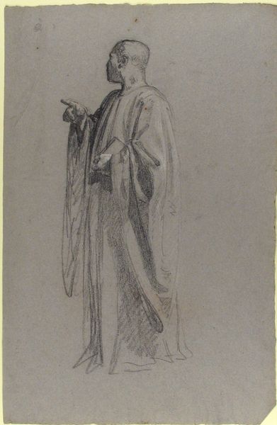 Curator: Let’s take a look at this compelling drawing. It is titled "Head of a Lawyer," created with pencil by Jean-Louis Forain. What's your first take on this one? Editor: Immediately, the upward gaze gives me a sense of lofty idealism or perhaps haughty self-importance, doesn't it? There’s a weightiness in those graphite lines too. Curator: Absolutely. Notice the hatching and cross-hatching techniques Forain uses to define form, creating both depth and shadow. The composition, while simple, emphasizes the character's features, especially that prominent moustache. The lines give so much dimension. Editor: Right. It certainly evokes the legal profession in late 19th or early 20th century France. Considering Forain’s sharp social commentary in his illustrations for newspapers like Le Figaro and Le Rire, I can't help but think about legal corruption during this time, don't you agree? Curator: Interesting point. I wonder if this drawing reflects, critiques, or perhaps embodies that zeitgeist, through composition and careful, deliberate strokes. Forain gives detail to the facial features only to abandon the idea and allow soft outlines of the robes. Editor: The robes and cap definitely solidify that visual narrative, representing authority and formality, while the loose lines almost allow some breathing room for something beyond an institutional critique. His face holds such expression. Curator: Exactly! It has to be a comment of Forain’s personal values and reflections through a larger statement of cultural critique. But one must be cautious not to over-interpret... Editor: Indeed, and it would seem Forain sought that in-between by creating so much in just a simple sketch. He captures something that even history is now having a conversation with today. Thank you. Curator: It certainly is remarkable that so much is evoked by so little here; it reminds one how powerful subtle lines and expressive marks can truly be! Thank you.