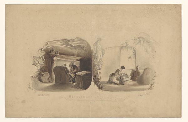 Marie-Alexandre Alophe created this lithograph titled, "Six Vignettes of Everyday Life." The composition immediately strikes us with its arrangement of six distinct vignettes. Each scene, framed within its own circular or rounded boundary, captures a slice of 19th-century life. What is immediately apparent is Alophe’s masterful use of line and texture to create depth and mood. The scenes range from domestic interiors to outdoor settings, inviting us to consider how space is constructed and inhabited. Each vignette functions almost like a stage set, with the figures carefully positioned to convey narrative. The contrast between light and shadow draws our eyes to the focal points of each scene, highlighting the artist’s ability to evoke emotion through subtle formal means. Alophe has structured each vignette with a semiotic system where the placement of figures, objects, and architectural elements tell distinct stories within the larger framework. The lithograph overall is not merely a depiction of everyday life but a carefully constructed representation. Alophe's work highlights the complexities of the semiotic representation of social narratives.