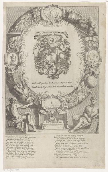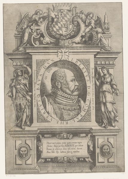 Curator: The print you’re viewing is entitled "Drie personificaties met wapen van Filips II," or "Three personifications with the coat of arms of Philip II," created around 1625. The print's creator is currently unknown and it utilizes engraving as a primary technique. Editor: At first glance, it feels grand and rather formal. I’m immediately struck by the three figures, but also by the incredible detail etched into every element. There's so much to unpack within this seemingly contained image, you could get lost for days in there. Curator: Precisely. This piece acts as an allegorical statement steeped in the political context of the time, depicting three figures around Philip II's coat of arms. It was designed during a politically sensitive moment, chronicling ongoing struggles of state and rule. Editor: Struggles made beautifully decorative! It’s curious to consider that in this case the aesthetic power almost overshadows what's ostensibly a fairly serious claim being made. I'm especially drawn to the figure holding the scales. There is something captivating about its cool impassivity against what seems to be the potential to go down as history defining turmoil. Curator: Well, these figures each personify important virtues within the framework of governance – Justice and Peace are key visual representations to showcase a ruler's image in prints like these, a prevalent theme for the historical understanding of power. Editor: So it’s a controlled statement, really. A sort of symbolic reassurance or advertisement through idealized characters and symbols. Is there a feeling in historical circles whether this sort of propaganda of its time swayed popular belief or influenced political sentiment very much? Curator: Absolutely. These images disseminated specific narratives about Philip II and his reign. The distribution of such material shaped public opinion, legitimizing his authority by visually aligning him with these personifications of virtue and strength. It provided strong backing that legitimized claims to authority. Editor: Fascinating. The more you delve in the more fascinatingly multi-layered a piece emerges. I leave now admiring the complex blend of craftsmanship and propaganda, truly demonstrating that behind even apparently simple designs there can be a deep wealth of messages just waiting to be discovered and explored! Curator: Agreed. Reflecting upon the ways artists use symbolism as visual argumentation is central for assessing these pieces as they represent a valuable tool for navigating the currents of both artistic intent and power representation throughout history.