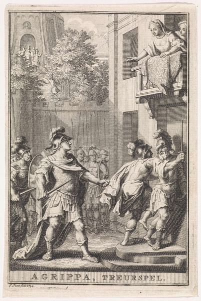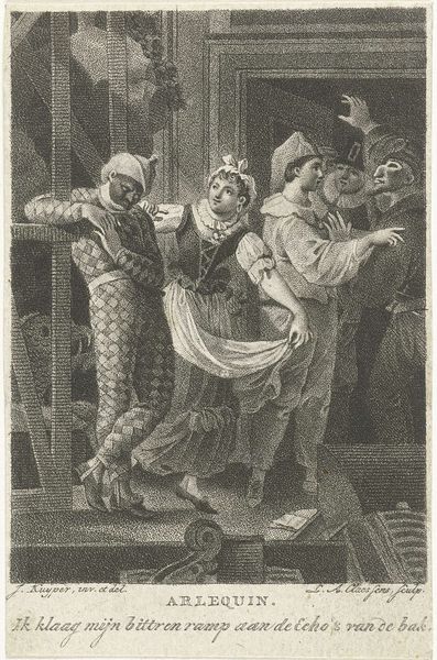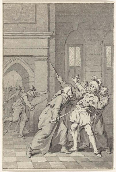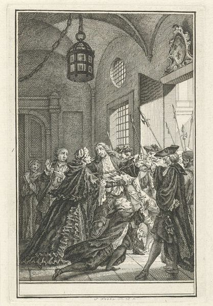 Reinier Vinkeles made this print depicting Burgemeester Westerwijk being led from prison, using the technique of etching. This intaglio printmaking method involves coating a metal plate with a waxy, acid-resistant substance called a ground. The artist then scratches an image into the ground, exposing the metal. When the plate is submerged in acid, the exposed lines are "bitten" or etched, creating grooves. The plate is then inked, and the surface wiped clean, leaving ink only in the etched lines. Under high pressure, the inked image is transferred onto paper, resulting in a print with fine, precise lines, seen here in the faces of the figures, and the vaulted architecture of the prison. Vinkeles's choice of etching, a process demanding skill and labor, elevates what might otherwise have been a fleeting political moment to something of lasting value. The print serves not only as a historical record but also as a testament to the power of craft in preserving and interpreting social narratives.