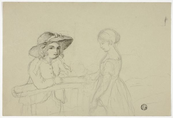 Curator: This drawing from 1858 is titled "Couple seated at a table," created by James Abbott McNeill Whistler using pencil. What is your initial impression of this seemingly simple piece? Editor: Stark simplicity! There's a poignant loneliness about these figures, rendered with such spare lines. The starkness is intensified by the subjects' enclosed space and inward focus. It speaks to constrained roles, like captured moments in an attic novel. Curator: I agree about the implied narrative tension, and it’s noteworthy that Whistler utilizes an academic-art approach to capture their essence. Consider the composition: the table acts as a strong horizontal plane, dividing the pictorial space, while the figures occupy distinct zones within it. The balance he strikes through this division is compelling. Editor: And the hat—what symbols! This seemingly oversized and sketchily-rendered hat dominates one side. Hats throughout history represent social identity, even status, here, a symbol that alludes to self-consciousness or societal conformity. One wonders what this conceals, culturally or even emotionally. Curator: Excellent observation, although Whistler leaves enough unsaid through suggestive strokes to maintain openness. Look at how he uses hatching and cross-hatching to suggest volume and depth, yet leaving certain areas deliberately vague and open to interpretation. This economy of line emphasizes the flatness of the picture plane. Editor: The woman’s bonnet, versus the other's bold hat, also whispers about power dynamics between genders in Victorian society. But their seated stillness emphasizes restraint. One wonders, are they waiting for someone? Discussing secret affairs? Their shared space amplifies those mysteries, as symbols. Curator: A very insightful consideration of Victorian symbolic vocabulary, though as a Formalist, I am hesitant to assign too literal an interpretation. Focus more directly on the quality of lines, their interaction, to reveal tension and structure. Ultimately, the sketch shows the artist’s understanding of perspective. Editor: Ultimately, perhaps both our interpretations offer another look. As you focus upon balance, I contemplate the weight of unacknowledged social expectations – each approach helps to enrich engagement within the art itself.