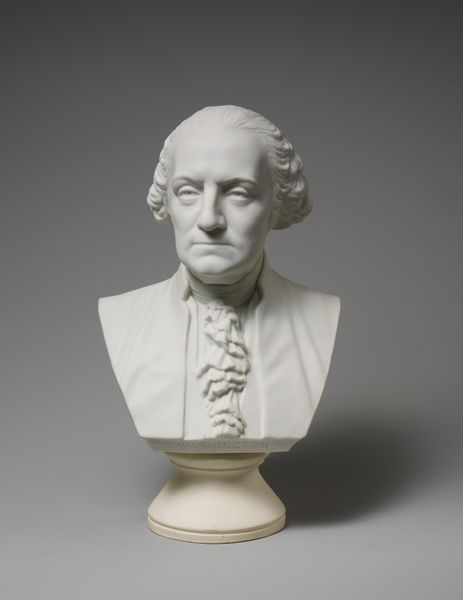 Curator: Here we have Jean-Baptiste Pigalle’s bronze sculpture of Jean-Rodolphe Perronet, completed around 1785. It’s an interesting piece that really reflects the Neoclassical style. Editor: My first impression is one of quiet power. There’s a restrained intensity in his gaze and in the way his jaw is set that seems quite deliberate. The dark bronze enhances that gravitas. Curator: Absolutely. Perronet was a renowned bridge builder, and this portrait encapsulates that status perfectly. But it's vital to consider the sociopolitical context in which Pigalle was working. The late 18th century in France was a period of great upheaval, and this bust, like so many other works of the time, engages with notions of power, legacy, and revolution, however subtly. Editor: I'm immediately drawn to the symbolism in the details—the careful rendering of the wig, for example. It speaks of status, but it also speaks to a performative aspect of identity. The wig and formal attire served as an external expression of established norms during this time period. Curator: Precisely. Pigalle isn't simply depicting Perronet; he's creating an emblem. He wants us to understand how Perronet aligns—or perhaps deliberately sets himself apart—from certain political trends of the moment. Looking at the history, one is compelled to note his contribution to the École des Ponts et Chaussées, or National School of Bridges and Highways, and consider how figures like Perronet facilitated France's transportation system at the expense of more just distributions of economic resources. Editor: This piece embodies contradictions; on one hand we have his stern, knowing eyes representing accumulated wisdom; but in constrast the rigid formality of his presentation reflects an entrenched, perhaps ossified social hierarchy. I think viewers need to consider whether he, even through representation in art, has truly earned his serious stature, or if it's more complex than that. Curator: Indeed, the artist, by fixing him permanently in bronze, asks future viewers to remember, to critique, and to evaluate his life and his labor. Editor: Examining symbols alongside sociopolitical factors gives us deeper appreciation of the piece as well as its lasting resonance. Curator: It leaves you contemplating what success, and who history remembers, looks like then, and now.
