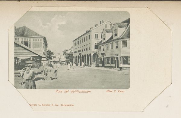 C. Kersten & Co. made this photo of Watermolenstraat in Paramaribo, though we don’t know exactly when. It has the sepia tones of old postcards, or a memory fading at the edges. The image quality isn't perfect, it's a bit mottled like an old print, but that adds to its charm. There's a kind of layered effect where the light and shadows play across the buildings; it feels like a soft, warm day. Look at the pair of figures in the center. The artist captures a specific moment but it feels universal, like any two people stopping for a chat on a sunny street. It reminds me of those early street photography experiments, where the focus is less on perfection and more about capturing a fleeting moment in time. You could compare this to the work of Eugène Atget, who photographed Parisian streets at the turn of the century. Both artists share a fascination with the everyday, finding beauty in the ordinary. There are no fixed meanings here, just a sense of life unfolding.