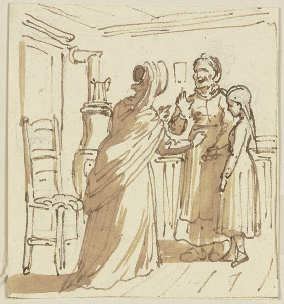 William Edward Frost created this pen and brown ink and watercolor artwork called 'Two Women in Late 18th Century Dress' which now resides at the Art Institute of Chicago. The painting is dominated by a monochromatic palette of blue-gray washes. This imbues the scene with a certain contemplative stillness. The composition features two women, their elegant attire rendered with quick, fluid strokes that emphasize form over detail. The woman on the left is seated, while the other stands, engaging in conversation, her posture suggesting a dynamic presence. Frost’s method of transparent watercolor washes allows light to penetrate and reflect off the paper. This creates an airy quality that softens the rigid formality often associated with portraiture of this era. In its understated and elegant way, the artwork is not just a depiction of period fashion but also an exploration into the artistic possibilities of line, form, and tonal variation. This is made possible by the chosen medium. This reflects an interest in the inherent qualities of his materials, typical of his time.