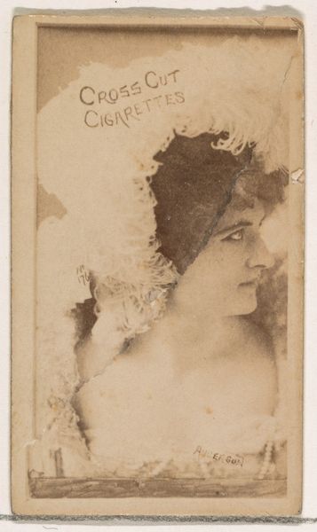 Curator: Here we have an advertisement card from the 1880s created by W. Duke, Sons & Co. as part of their "Actors and Actresses" series promoting Cross Cut Cigarettes. This particular card features a woman identified as "Van Osten." Editor: It has such a sepia, ethereal quality. It makes me feel nostalgic, but in a way that acknowledges a certain distance, a kind of bygone artificiality. It’s a posed world we’re looking at. Curator: These cards, initially included in cigarette packs, were immensely popular, sparking a collecting craze. Think about how tobacco companies strategically utilized celebrity endorsements to boost sales and cultivate brand loyalty. It reflects the rise of mass media and consumer culture. Editor: Right. The way they use the female image is central to their strategy. We can see how idealized notions of femininity were exploited to sell these products, linking performance and identity to consumption in problematic ways. How much were these women in control of their image at this time? Curator: That’s a great point. The distribution of these images through mass-produced cards certainly amplified their reach, but it also commercialized them. Consider, too, that many of these actresses were gaining visibility during a period of social change, particularly for women entering the workforce. Editor: Precisely. And the presentation here reinforces certain expectations – she’s decorative, poised… It underscores that the performing arts, especially for women, often existed under a scrutinizing male gaze. This advertisement becomes another venue for that kind of display and commodification. Curator: Yes, this single image acts as a convergence point. It reveals the celebrity culture, the nascent advertising industry, and also anxieties of female performers' public personas at that moment. All within the context of tobacco consumption, which has its own implications. Editor: Looking at it now, it feels so layered. It highlights the constructed nature of fame and identity, even as it worked as a straightforward advertisement at the time. We are given much to consider, regarding representation, agency, and the history of consumerism. Curator: A simple card with a not-so-simple past.