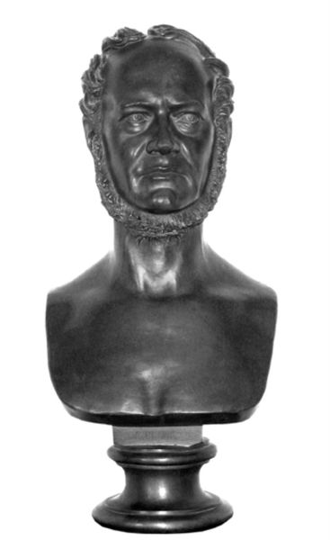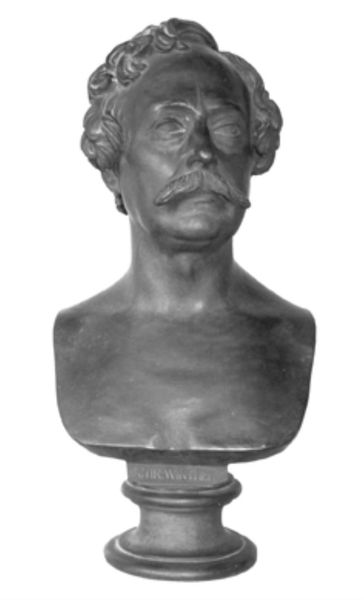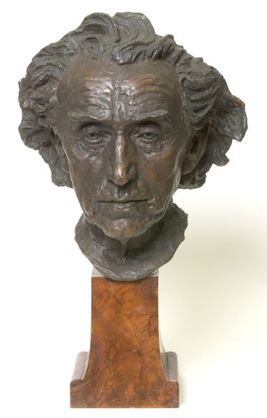 This bronze bust of the composer J.P.E. Hartmann was crafted by H.W. Bissen. Notice the classical inspiration in the bare chest and the pedestal, a direct reference to the Roman tradition of commemorating important people through portrait sculpture. This choice connects Hartmann to a lineage of revered figures, invoking notions of timelessness. The slightly parted lips and thoughtful gaze suggest not merely a likeness, but an idealized representation of intellectual depth. Consider also the symbolic weight of bronze itself. Since antiquity, it has been associated with durability, and strength; the idea of the sitter’s legacy enduring through time. It recalls the tradition of classical portraiture to immortalize great leaders and thinkers. This is not just a portrait; it's an attempt to capture and preserve something essential about his spirit. The bust speaks to a deeper, more primal desire to overcome mortality.