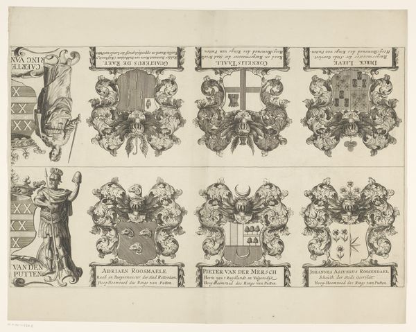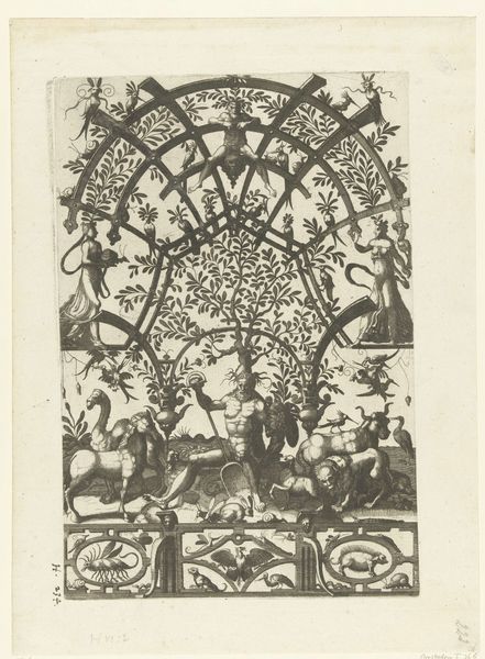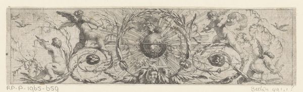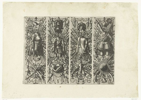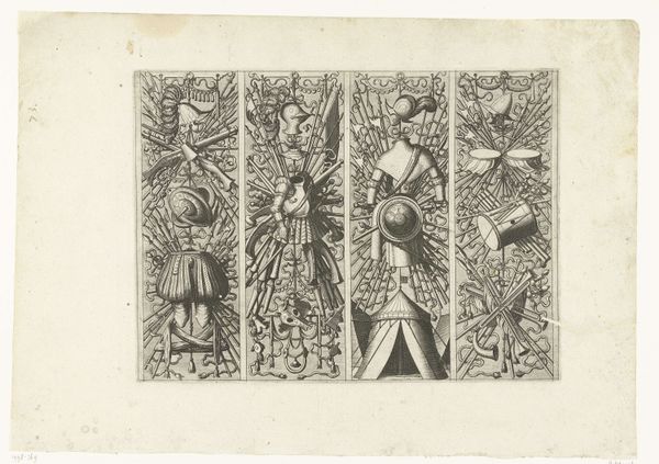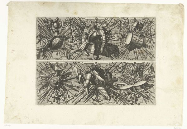Curator: Oh, this engraving just pulsates with Renaissance machismo, doesn't it? I mean, just look at those helmets practically screaming, "We conquered things!". Editor: I’m immediately struck by how meticulously detailed it is. This is "Two Half Circles with Trophies of Weapons and Armor above a Horizontal Trophy with Weapons and Musical Instruments" by Johannes or Lucas van Doetechum, dating back to 1572. It’s a print, engraving, and drawing on metal, all rolled into one complex piece. Curator: A multi-threat work, as it were! What hits me is this crazy tension—the elegance of the lines clashing gloriously with all this aggressive symbolism. It’s like, pretty death! Or perhaps deadly pretty! Editor: That tension, I think, speaks volumes about the period. The rising merchant class acquiring the trappings of nobility, for instance. All this gleaming armament wasn’t necessarily about combat; it could also be a potent display of newly-minted social status, wealth, and power during an era of massive social upheaval. It's a semiotic claim as much as a record. Curator: So, fashionably intimidating, then! Like a Gucci tracksuit made of plate armor. Seriously, though, the way those trophies are arranged, it’s theatrical! Like staging for the apocalypse with panache. And juxtaposed with musical instruments?! How terribly, terribly odd...or is it? Editor: The instruments could represent a call for order or even a prayer for peace in tumultuous times, the type that might accompany a grand ceremony. They can stand in sharp contrast to the cold, hard reality of war. These objects aren’t isolated in this work; rather they create a richer cultural context about civic duty in that moment of history. The inclusion might suggest the balance needed between the instruments of war and a harmonious society. Curator: It’s still a bit like someone blasting Vivaldi at a black metal concert, don't you think? Though, I suppose, war often did come with its own soundtrack of sorts, didn’t it? Editor: Absolutely, so this wasn't necessarily as discordant to audiences back then as it appears to our modern ears and eyes. Context, context, context! Curator: Ah, context! Always a mood killer! Only joking—I do suppose you have put my noisy, shiny conquistadors properly in their place, which makes the picture as a whole even more evocative. I leave feeling… not necessarily better about conquest, but a good deal more informed! Editor: And perhaps considering what we "fetishize" today in ways that reflect similar concerns.