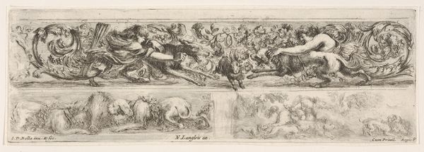 Curator: Let’s examine this engraving, "Two Designs for Friezes or Consoles characterized by Armorial Trophies," Plate 6 from 'Decorative friezes and foliage,' created by Stefano della Bella between 1645 and 1650. It’s quite striking, isn't it? Editor: Indeed. My immediate impression is one of controlled chaos. There's so much intricate detail packed into a limited space. The contrast of light and shadow creates a rather theatrical mood. Curator: I concur. The strategic arrangement of shapes generates tension and movement across the composition. Observe how della Bella employed fine lines to suggest volume, animating otherwise static heraldic motifs. Editor: And what an abundance of heraldic motifs! The prominent inclusion of animals – lions, dogs, and a bull– immediately speak to power, loyalty, and virility, frequently utilized as signifiers of noble houses and established bloodlines during that era. What is their relationship, or intended function in the frieze? Curator: It seems, that the careful rendering of textural contrast between the fauna fur, the hard stone elements, and even what appears to be flowing fabric, enhances our tactile engagement with the imagery. These textures, and their semiotic relationship become the ornament’s inherent structure. Editor: You are spot on; notice how elements like helmets, shields, and trophies weave a compelling narrative about social standing and authority. I am curious to learn where such ornamentation might be placed – a domestic interior perhaps, or maybe exterior spaces. Curator: Precisely, these prints functioned as guides for artisans. Della Bella provides sophisticated visual vocabulary – a pattern language ripe for interpretation within myriad architectural settings. Each animal functions almost like a morpheme in the lexicon. Editor: To build on that thought – consider that in heraldry, everything from the posture of an animal to the choice of tincture conveys layered information. The work is rich with iconographic programs that were immediately accessible to contemporary audiences. Curator: So, it’s fascinating to see how an artist fuses structure with such recognizable forms to generate these densely packed designs. Della Bella expertly balances legibility with ornamental flourish, pushing against the edge of perceptual overload, and offering a lens into historical cultural and visual cues. Editor: This has provided such a vibrant image for understanding how these signs operate formally, structurally, and, of course, symbolically in works of art.
