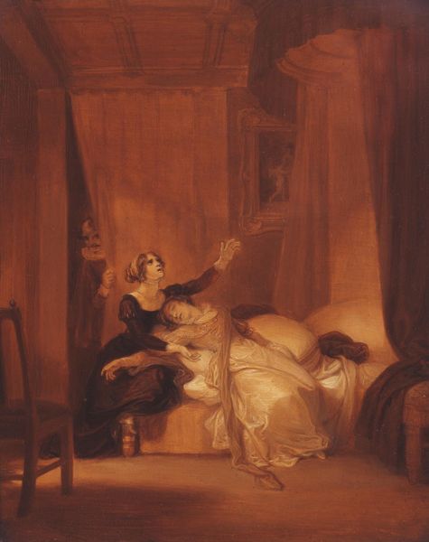Editor: Joseph Highmore's "VII: Pamela in the Bedroom with Mrs Jewkes and Mr B." presents a rather tense domestic scene. The figures seem confined, almost staged. What symbols might be at play here? Curator: Consider the veil, the bed, the shadows. The veil often signifies concealment, perhaps innocence threatened. The bed, a space of vulnerability, is dominated by the older woman. Doesn't the very darkness suggest a moral unease, a struggle for power? Editor: That's fascinating. So, it's not just a scene, but a coded representation of virtue under duress? Curator: Precisely. Highmore uses these visual cues to tap into a cultural understanding of virtue, temptation, and the anxieties surrounding female agency. Editor: It really shifts my perspective. I initially saw a simple narrative scene, but now I see a complex symbolic drama. Curator: The power of images lies in their layered meanings, reflecting our shared history and anxieties.