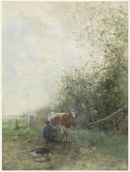 Willem Maris painted "Koeien bij een plas" with watercolor on paper. Watercolor is a very immediate medium. It is portable, allowing for outdoor work, and relatively quick to dry. Notice how the artist's chosen materials and processes influence the appearance of this painting. Maris has used thin washes of color to capture a fleeting moment in nature. The transparency of the watercolor allows the white of the paper to shine through, creating a luminous effect. With fluid brushstrokes, he has evoked the damp atmosphere of the Dutch landscape. In Maris’ time, painting ‘en plein air’, as it’s called, was still a relatively new trend. Before pre-mixed colors in tubes were available, artists usually worked in the studio from sketches. Maris embraced the freshness that watercolor offered, a directness akin to craft practices. His deft handling of the medium elevates a humble scene to a work of art. By attending to such works, we can challenge traditional distinctions between craft and fine art.