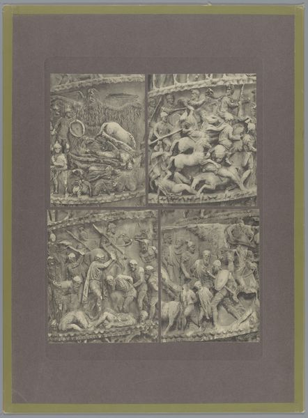 Editor: Here we have “Sheet with Scenes of Peasant Life in Seven Rows,” made sometime between 1783 and 1815. It’s in the Rijksmuseum, and it appears to be a drawing or print, maybe even a textile… It's a rather curious grid of what look like golden figures on a grey field. It almost resembles a sampler or something similar… so intricate! What catches your eye in this piece? Curator: It feels almost like a secret language, doesn't it? Like peering into someone’s memory of a bustling village life. Those golden figures, somewhat romanticized I'd argue, become miniature actors playing out a quiet drama. Consider it: a moment of intimacy and domesticity right next to what seems like public pronouncements and displays of status! What I find particularly interesting is that each little scene doesn’t scream for your attention. They murmur. Did you notice the bottom row, how it's mostly equestrian figures and scenes of travel? It makes me wonder about the artist's own longing for escape, a world beyond those little dramas they were depicting in the rows above. Do you feel that contrast? Editor: I hadn't really considered the idea of "escape", but now I see it. Especially contrasted with the domestic scenes, it really does have that tension between settling in and moving on! Curator: Precisely! And that tension gives the piece its subtle dynamism. Even within those rigid rows, life’s little dramas unfold, capturing both the comfort and the yearning that make us human. Perhaps it's a testament to our simultaneous desire for rootedness and freedom. A visual poem, if you will. Editor: It’s like a little world captured on paper. I think I get what you mean by the 'quiet drama', there's such a complexity in these seemingly simple vignettes. Thank you. Curator: And thank you. Sometimes, art invites us not just to see, but to feel – and perhaps, to remember parts of ourselves we thought we had forgotten.