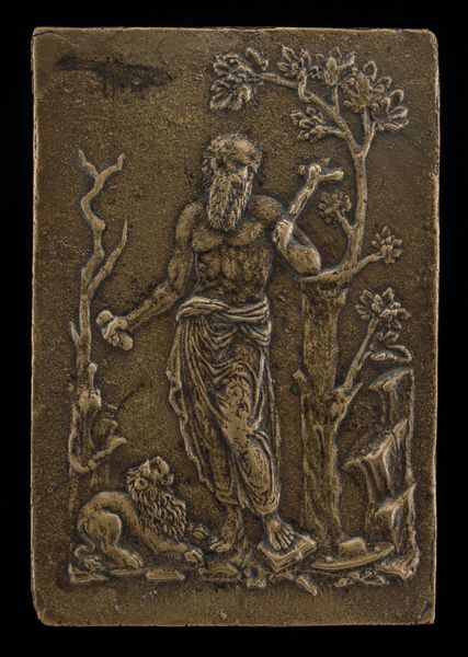 Curator: Welcome. Today we're examining "Apollo and Marsyas," a bronze relief likely created in the early 16th century. It's a fascinating depiction of a pivotal moment in Greek mythology. Editor: The first thing that strikes me is the palpable tension. Apollo exudes an almost arrogant calm while Marsyas, captured mid-dance, appears unaware of the looming doom. There’s a stillness to the form. Curator: Indeed. This relief encapsulates the story of their musical contest, judged—unfairly, many would argue—by King Midas. The aftermath, as the myth tells it, is notoriously gruesome; Apollo flays Marsyas alive for daring to challenge his artistic superiority. Editor: Which immediately forces a reading that questions the narrative itself. Is it truly a celebration of divine talent, or a condemnation of unchecked power and brutal silencing of dissenting voices? You immediately feel the unfairness of a system weighted against the challenger. Curator: The piece speaks to the social order of the time it was crafted, of course. Artists during the Renaissance often used classical narratives to subtly comment on contemporary power dynamics. Consider how guilds, patronage, and even artistic academies operated then; it mirrors, to some extent, this struggle between an established authority and a newcomer. Editor: And we have to think about the legacy of this particular myth: artistic innovation versus institutional control, high art versus folk traditions. Marsyas was a satyr, linked to the wild and Dionysian, a challenge to Apollo’s structured, harmonious world. Look how this bias gets reproduced here, in a work immortalizing a moment of cruelty and exploitation in what, historically, had often been read as simply a story of triumph. Curator: What do you make of the medium? Bronze, of course, lends a certain gravitas, linking back to classical sculpture and legitimizing the narrative, but I find it compelling when put against the context you rightly introduce. Editor: The burnished surface and high relief gives a weight to the figures that feels... oppressive. And the detail on Apollo’s robes versus Marsyas’s more roughened form even feels loaded—literally, representing status. Curator: Ultimately, a piece like this makes us question not just what the artist intended, but how successive generations have interpreted, and perhaps justified, hierarchies of power through art. Editor: Right, it’s a visual embodiment of how narratives get shaped—and who gets to do the shaping. Let’s not take stories at face value but understand the societal underpinnings that enable their distribution. It offers critical space for deconstruction of the myths and histories we think we know.
