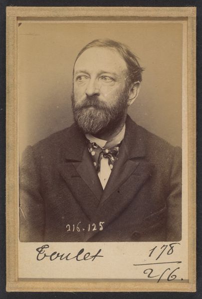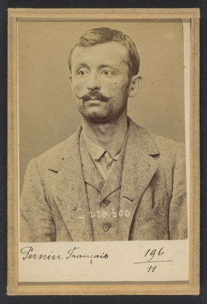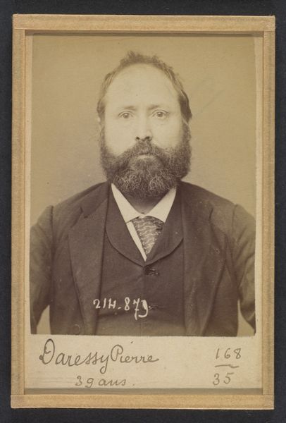 Editor: This gelatin-silver print, titled "Kern. Jacob, Hermann. 33 ans, né le 26/8/60 à Berlinger (Suisse). Comptable. Anarchiste. 10/7/94" and created by Alphonse Bertillon in 1894, feels incredibly stark. The man's direct gaze is unnerving, especially with the added text below the portrait that provides a snapshot of his identity: name, age, profession, and political leaning, as an Anarchist. What do you see in this piece? Curator: I see a document shaped by the intersection of state power and emerging photographic technology. Bertillon’s project wasn't merely portraiture; it was about crafting a system of surveillance, a means of control through the mass production and classification of images. Note the use of gelatin-silver print, a relatively new technology at the time, allowing for easier replication and dissemination of images. This speaks volumes about the institutional desire for efficiency in identifying and managing individuals deemed “deviant.” Editor: So you are saying the photograph served primarily as a tool to classify people? Curator: Exactly! Consider the meticulous detail in recording Kern's personal information. This isn't art for art's sake, but art as a function of a bureaucratic apparatus. The work reflects the larger social anxieties around anarchism at the time and the state's efforts to neutralize such threats through a systemized approach to tracking people. Also think about what the subjects in this new medium thought; the dynamic is as crucial to understanding the artifact as the final output itself. Editor: I see. So, it's not really about the individual, but the system that produced this image and what its use was? It sounds like an impersonal and extremely dehumanizing approach. Curator: Precisely. By focusing on the material process and the social context, we uncover a critical commentary on power, control, and the objectification of individuals within systems of governance. This portrait embodies the anxieties of an era grappling with rapid social and technological change. Editor: That gives me a completely different perspective. I'll definitely consider all of that next time I look at it.