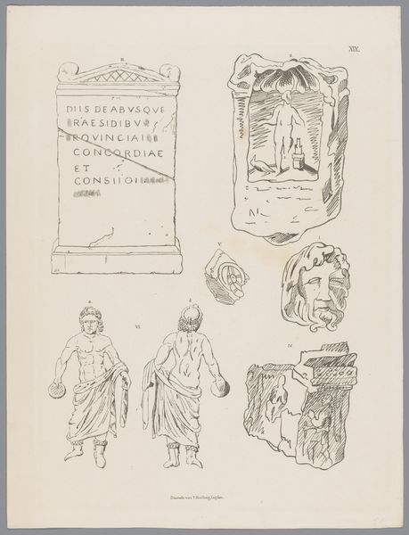 Curator: At first glance, I see something akin to an architectural elevation drawing, albeit with an archaeological sensibility. Editor: Precisely. What we're observing here is a print from between 1843 and 1845 by Tiemen Hooiberg titled "Fragmenten van vier altaren, waaronder twee Nehalennia-altaren, pl. XVIII," or "Fragments of four altars, including two Nehalennia altars, plate XVIII." It appears to be a meticulous rendering, primarily utilizing etching techniques to depict ancient altar fragments. Curator: The linear precision is remarkable. Each stroke serves to articulate not just form, but also the weathering, the history etched – quite literally – onto the surfaces of these stone relics. I’m drawn to the lettering… what can you tell me about these inscriptions? Editor: The inscriptions are key. Nehalennia was a local goddess, worshiped in the Roman province of Germania Inferior, primarily in the Zeeland region of what is now the Netherlands. These altars, dedicated to her, speak to the syncretism of Roman religious practice and local belief systems. You see dedications "DEAE NEHALENNI," to the goddess Nehalennia. Curator: Ah, so each altar piece then isn’t just a marker of faith, but a convergence point, where the local meets the global. Does the composition reflect that meeting of cultures, perhaps by style and construction methods or choice of materials available? Editor: Yes, that tension is at the heart of understanding such objects within their cultural context. The altars themselves, erected by merchants and sailors seeking safe passage, are physical embodiments of trade networks and the negotiation between Roman imperial power and local deities. Hooiberg's etching, then, further mediates our understanding by documenting and classifying these fragments in a rapidly modernizing world increasingly shaped by ideas of history and heritage. The way the objects have been drawn and assembled creates its own meaning. Curator: Absolutely, Hooiberg is part of that ongoing conversation of heritage itself. In this plate we're witness to faith, trade, artistic rendering, cultural continuity and all sorts of lovely conversations in time. Editor: Precisely. It reminds us how material culture and artistic documentation are invaluable for tracing the intertwined pathways of culture, religion, and power across history.
