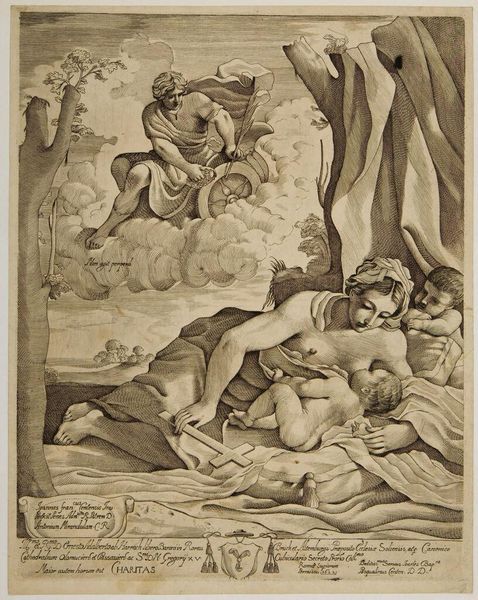 Editor: This is Giovanni Battista Pasqualini’s 1622 engraving, "Liefde (Caritas)." The stark contrasts really grab your attention. It’s packed with figures, but the composition feels very deliberate, almost mathematical. What stands out to you formally in this piece? Curator: The interplay of line and form certainly dictates the reading of this work. Note the sharp delineation, characteristic of engraving, defining each figure and object. This clarity lends itself to a rigorous, almost diagrammatic articulation of space. Consider the pyramidal structure: the maternal figure at the base, rising to the celestial figure above. The artist carefully guides the viewer's eye, but to what effect? Is it successful at harmonizing the earthly and divine realms, or does it create a sense of visual imbalance? Editor: I think the linear precision almost flattens the space. The clouds beneath the top figure feel… separate, somehow. Curator: Precisely! Observe the stark contrast in textures: the soft, rounded forms of the bodies juxtaposed with the harsh, angular lines of the clouds and drapery. Does this visual discordance, then, contribute to or detract from the symbolic harmony intended by the artist? What relationship do you perceive between these elements? Editor: It feels like a deliberate tension. The textures push and pull at each other, heightening the allegory's complexity. Thank you, that changed how I see the figures as relating to each other. Curator: Indeed. Appreciating this formal dichotomy encourages a deeper appreciation of Pasqualini's skillful control over visual language and his engraving work as a symbolic carrier.