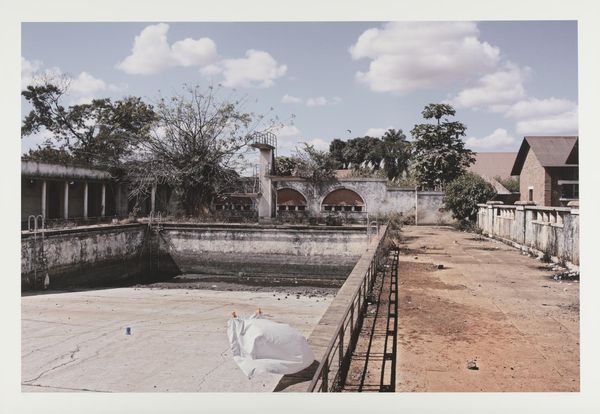 Curator: Guy Tillim’s photograph, "Park in the centre of town, Gabela, Angola," captures a scene that feels both familiar and distant. Editor: It’s hauntingly beautiful, isn't it? The way the light filters through what’s left of the playground, and this building looming behind. Curator: Tillim, born in 1962, often explores post-colonial landscapes and the marks left by history on urban spaces. This image resonates with those themes. Editor: Absolutely. It’s as if time has stood still, or perhaps moved on and left this place behind. There is this sense of absence and memory. The Toyota sign is the oddest thing. Curator: The "Toyota" sign, a ghostly echo of commerce. It’s a sharp reminder of globalization's reach, but also its fragility in the face of social and political upheaval. It also makes me think of car trips to the park. Editor: Right? There is something deeply poetic about that juxtaposition—a once-vibrant space holding these layers of personal and global history. Curator: Precisely, a layered photograph that asks us to contemplate the intersection of play, commerce, and history. Editor: A space where a child's laughter might have once echoed, now replaced by a profound, lingering silence.