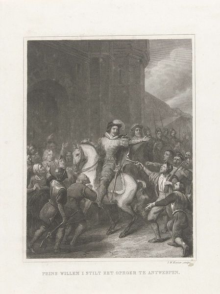 Jan Frederik Christiaan Reckleben created this print, “Attack on William of Orange by Jean Jaureguy, 1582,” sometime in the mid-19th century. A flurry of grey and white activity surges towards us, the cross-hatching of the print creating a sense of depth that pulls us into the conflict. The composition divides into three distinct zones: the foreground where the fallen assassin lies, the jostling middle ground, and the distant background of onlookers, all framed by the archways of the building. Reckleben employs line and shadow to focus our attention on the figures surrounding William, creating a dense knot of action and reaction. The print's formal structure offers a reading of power and chaos. The stark contrast between light and dark emphasizes the drama of the moment, but also suggests a deeper structural tension. By emphasizing the inherent drama through the arrangement of shapes, the composition engages in a discourse about historical violence. The structural patterns reveal power dynamics within the narrative, where chaos is both a consequence and an expression of conflict.