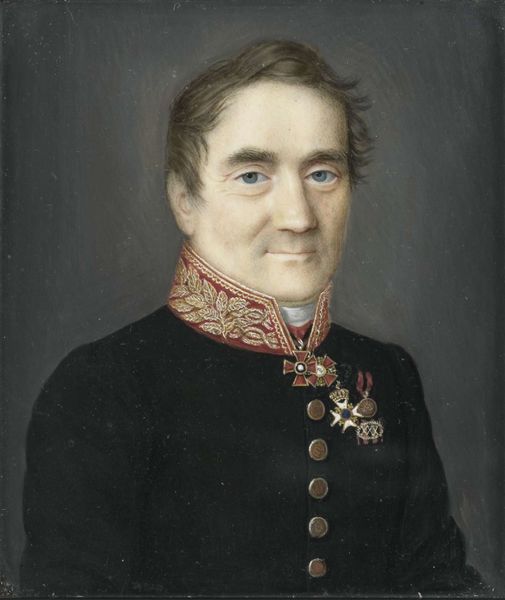 Editor: This miniature portrait from 1804 depicts Carel Hendrik Ver Huell. Painted by Louis Marie Sicardi, the oil on, presumably, panel, seems so delicate, but simultaneously assertive. It must have taken an incredible level of artisanal skill to achieve. What strikes you when you look at this piece? Curator: I immediately consider the raw materials – the pigments meticulously ground and mixed with oil, the panel carefully prepared. Sicardi’s labor is visible in every brushstroke, and that labour reflects the larger context of artistic production during the Napoleonic era. Consider where Sicardi might have acquired these resources; was it a highly localised activity? Editor: That’s interesting; I hadn't considered the geographic element. I was just seeing the artistry itself. What does focusing on the materials and labor tell us that we might otherwise miss? Curator: By interrogating the means of production, we disrupt the romantic ideal of the artist as a lone genius. The crafting of a portrait like this depended on a complex network of suppliers, apprentices, and patrons. This miniature served a particular function, too, circulating images of power and authority in a way mass production hadn't yet enabled. The gold frame is integral to its value, literally and figuratively, emphasizing the wealth and status it signifies. Editor: So the frame and the materials are also performing an action, not just 'being'? Curator: Precisely. Consider the societal forces that are in play. This portrait represents a certain kind of consumption, the commodification of image and status. How does understanding this change your initial reaction? Editor: I see how understanding the production process adds another layer. It is about skill, but also about the material conditions of the time. Thank you; I’ll certainly view similar works through a different lens now.
