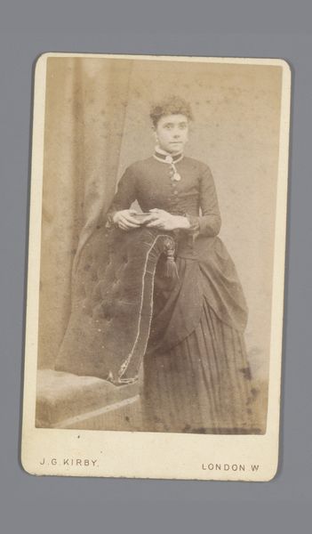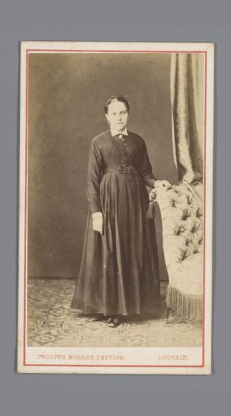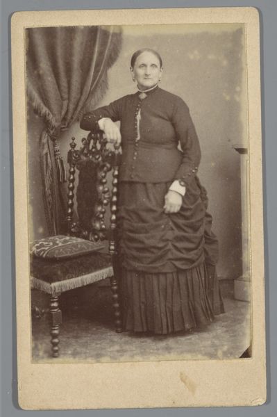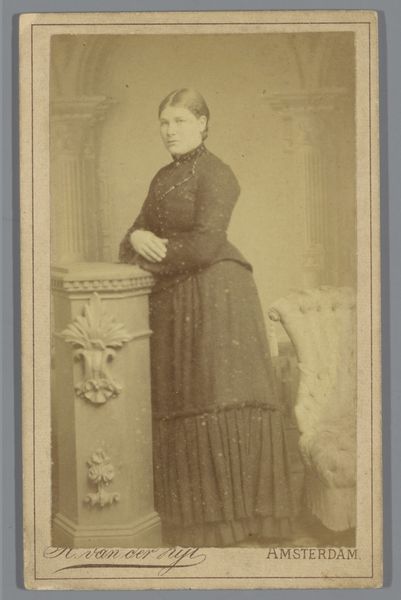 This is a photograph, likely a carte-de-visite, by Hermanus Jodocus Weesing, portraying an unknown woman, made using albumen print. The composition is vertically oriented, focusing on the figure posed against a neutral backdrop. Weesing employs a subdued tonal range, with soft contrasts which lend the image a somewhat melancholic feel. The woman is positioned asymmetrically, leaning slightly on a decorative pedestal to her right, balancing the visual weight with a small ornate chair on the opposite side. The careful arrangement of props and the woman's posture create a sense of stability and poise. In terms of semiotics, the woman’s clothing, the props, and her reserved demeanor all speak to the cultural codes of the period. The photograph encapsulates a moment in time, carefully constructed to convey particular social meanings related to identity and status. The sepia tones, the formal pose, all contribute to the photograph's function as a cultural artifact, reflecting both individual representation and broader societal values. As viewers, our interpretation is thus a process of decoding the layers of meaning embedded in its visual form.