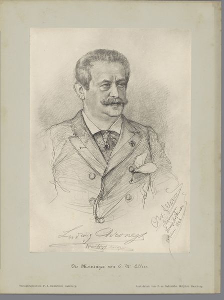 Curator: Let's discuss this portrait drawing, attributed to an anonymous artist after a photograph of Willem Witsen, and dating roughly from 1860 to 1915. It's a compelling piece in graphite and pencil, currently residing here at the Rijksmuseum. Editor: My first thought is of its intimate yet distant mood. The soft shading almost seems to veil the sitter, creating a sense of both presence and unknowability. Curator: The artist's application of pencil is indeed skillful. Notice how the delicate hatching defines the planes of the face and clothing, rendering depth with subtle gradations. The strategic use of light, particularly on the forehead and cheek, draws the eye and articulates the form. Editor: The mustache and bow tie, however, are so prominent; they can’t be accidental. A powerful moustache was a visual signifier of status and masculinity during the late 19th century, and a very specific archetype of manhood. We see it everywhere. This image carries echoes of that era, but subtly undermines them. It does invite thoughts about how social identities become crystallized—even fossilized—through repeated symbols. Curator: The choice of graphite and pencil itself adds to the work’s texture. Pencil lends itself to very accurate drawing, and with this choice of the artist we clearly have the impression that he strives to make an attempt for pure, direct representation. However, the lack of vibrant colour actually suggests the monochrome qualities associated with earlier photographic techniques. Editor: And what of Witsen himself? He wasn’t merely an anonymous face. Considering his role in Dutch artistic circles of that era—as a photographer, etcher, and writer, we cannot ignore this specific portrayal of his public self. What can this seemingly straight forward representation teach us about the act of self-portrayal and preservation of identity, through symbolic visual markers? Curator: Perhaps it's precisely the confluence of artistic skill, material expression and the symbolic context that creates such an impact. Through its technical execution and its symbolic allusions, the drawing exists at the junction of time and meaning. Editor: Yes, this is much more than just a representation. Its strength lies in its delicate balancing act, prompting conversations about portraiture, identity, and the endurance of visual language.