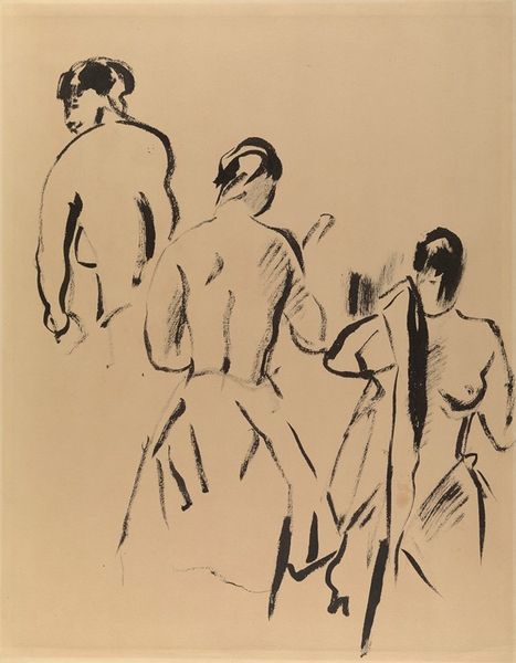 Curator: This is Ernst Ludwig Kirchner's "Nudes," held here at the Harvard Art Museums. Editor: The roughness of the charcoal gives it an immediate, almost confrontational feeling. It's raw. Curator: Indeed. Kirchner, as a key figure in Die Brücke, challenged academic artistic norms. The sketch’s bold lines and simplified forms reflect their rejection of bourgeois conventions. Editor: And you see that tension in the materiality. The choice of charcoal, readily available and inexpensive, democratizes the artistic process, pushing back against the elite's control of art. Curator: Precisely. These nudes weren’t about idealized beauty but about capturing the raw, unfiltered human experience. They reflect early twentieth-century anxieties. Editor: Looking at the process and materials used in the piece provides a deeper understanding of the historical narrative surrounding this piece. Curator: Absolutely. Kirchner's work here really does allow us to see his era and its challenges in such intimate terms.